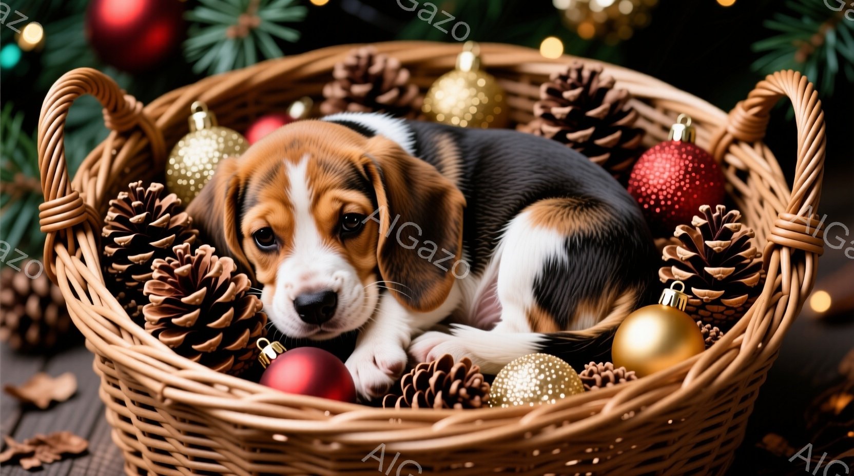 籐で編まれたバスケットの中に、小さなビーグル犬の子犬が丸まって眠っています。バスケットは松ぼっくりやキラキラしたオーナメントで満たされ、背景には緑の葉とぼやけた光が散りばめられ、クリスマスの温かく穏やかな雰囲気を醸し出しています。子犬はリラックスした表情で、クリスマスの装飾に囲まれて幸せそうに眠っています。