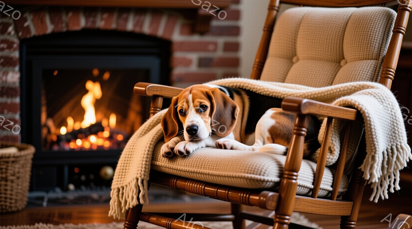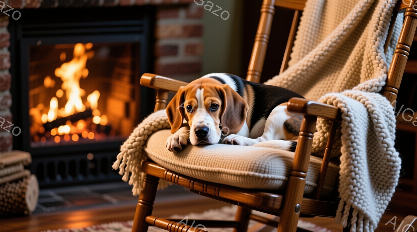 暖炉の前でロッキングチェアに横たわるビーグル犬が描かれています。犬はリラックスした表情で、ベージュ色のクッションと編み物のブランケットに包まれています。暖炉の炎と木製の床が、温かく居心地の良い雰囲気を醸し出しています。