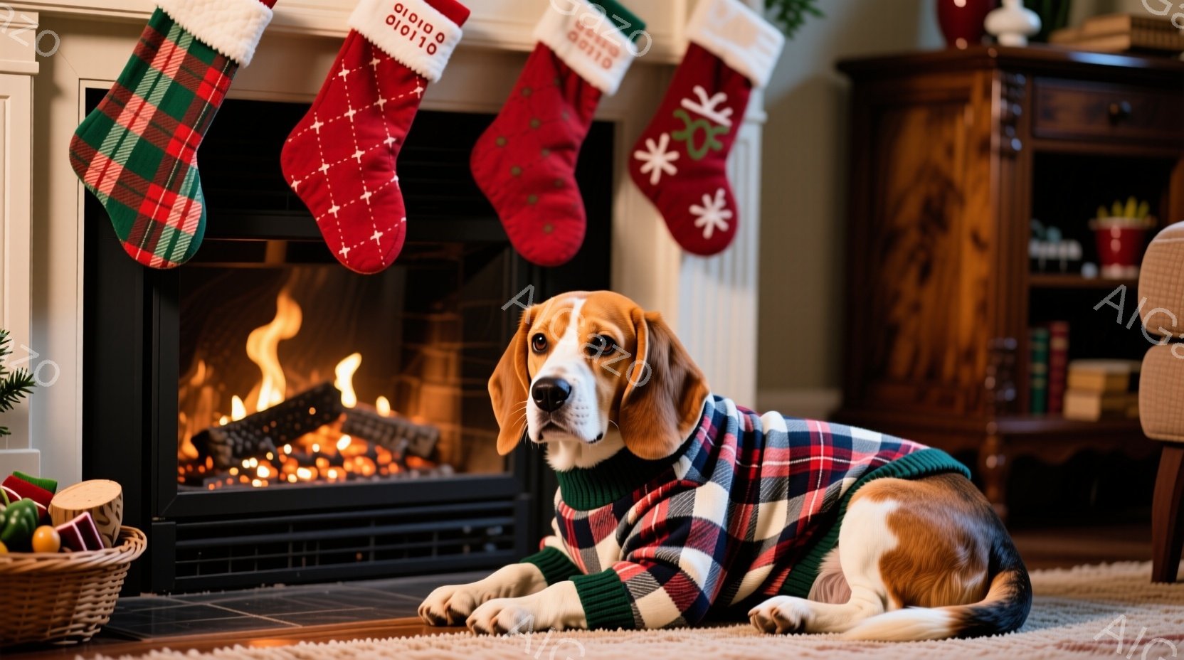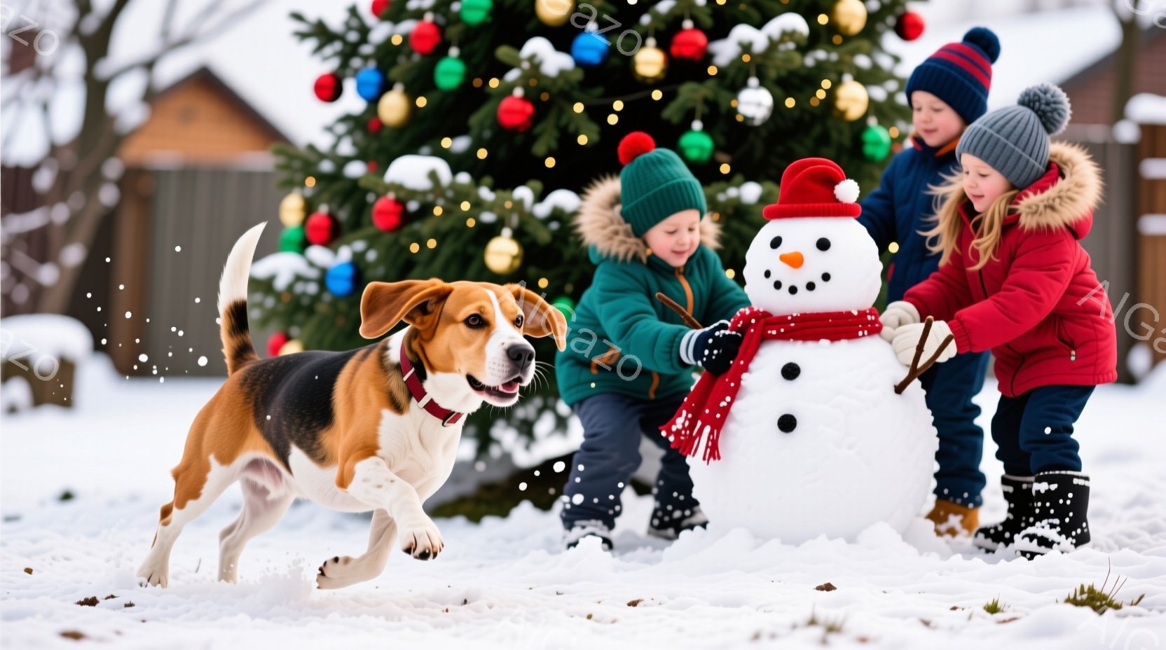 雪景色の中で、赤い毛並みの犬が元気に走り回っています。二人の子供は、手作りの雪だるまの周りで遊んでおり、女の子は赤い縞模様のマフラーを巻いて、雪だるまに飾り付けようとしています。背景にはクリスマスツリーが飾られており、雪が降る冬の暖かく幸せな雰囲気を醸し出しています。