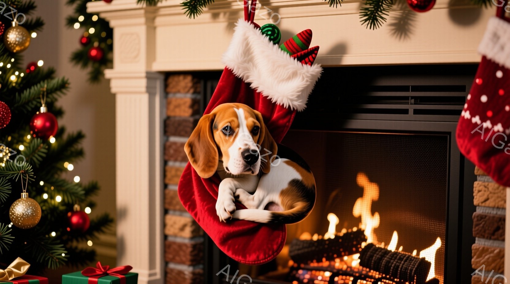 ビーグル犬が雪の積もった家の外の階段に座っています。犬は赤い首輪をつけており、真剣な表情で正面を見つめています。背景にはクリスマスのプレゼントの山と点灯したランタンがあり、冬の穏やかな祝祭の雰囲気を醸し出しています。
