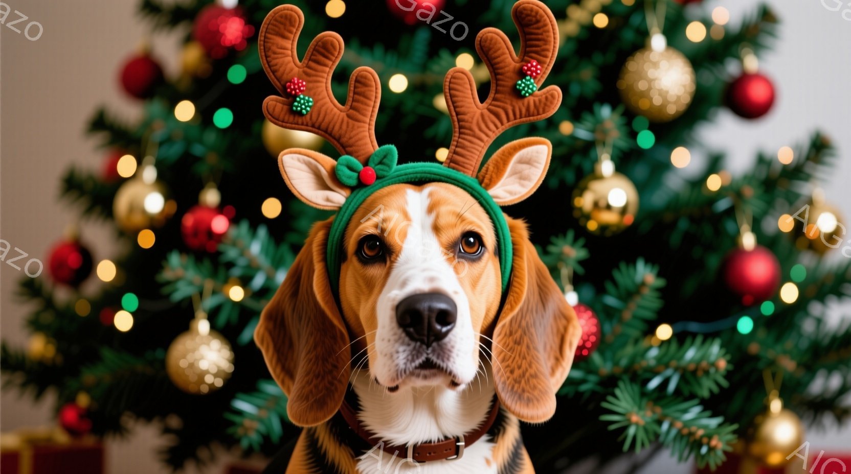 クリスマスの飾り付けられたクリスマスツリーを背景に、ビーグル犬が頭にトナカイの角のヘッドバンドをつけて正面を見ている様子を捉えています。犬は茶色と白の毛並みで、耳は垂れ下がっており、表情は穏やかで、カメラに向かってまっすぐ見つめています。背景のクリスマスツリーは、赤、金、緑のオーナメントで飾られており、暖かくお祝いの雰囲気を醸し出しています。