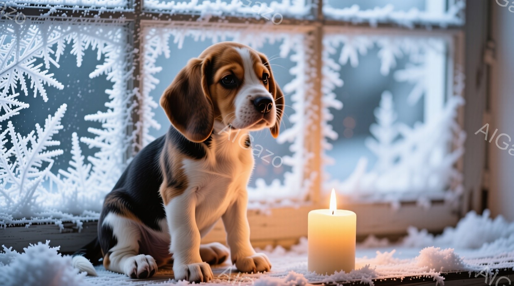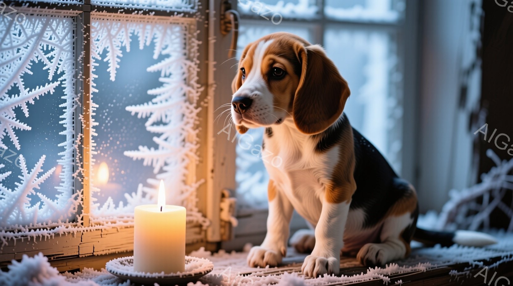 小さなビーグル犬が雪の積もった窓辺に座り、暖かく光るキャンドルを見つめている。窓には繊細な雪の結晶模様が描かれており、背景にはぼやけた冬の風景が見える。全体的に穏やかで温かい、冬の静寂を表現した雰囲気である。