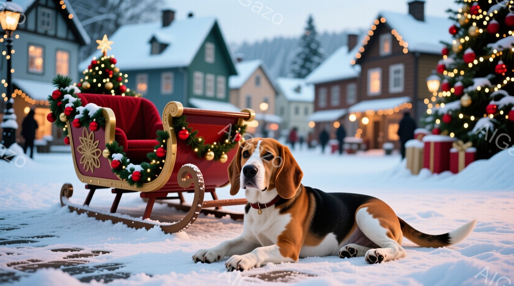 白い雪に覆われた町並みを背景に、ビーグル犬が赤いそりに寄り添って横たわっています。そりにはテディベアが座っており、犬はリラックスした様子で前方を向いています。背景にはクリスマスツリーが輝き、建物は装飾され、冬の暖かく幻想的な雰囲気が漂っています。