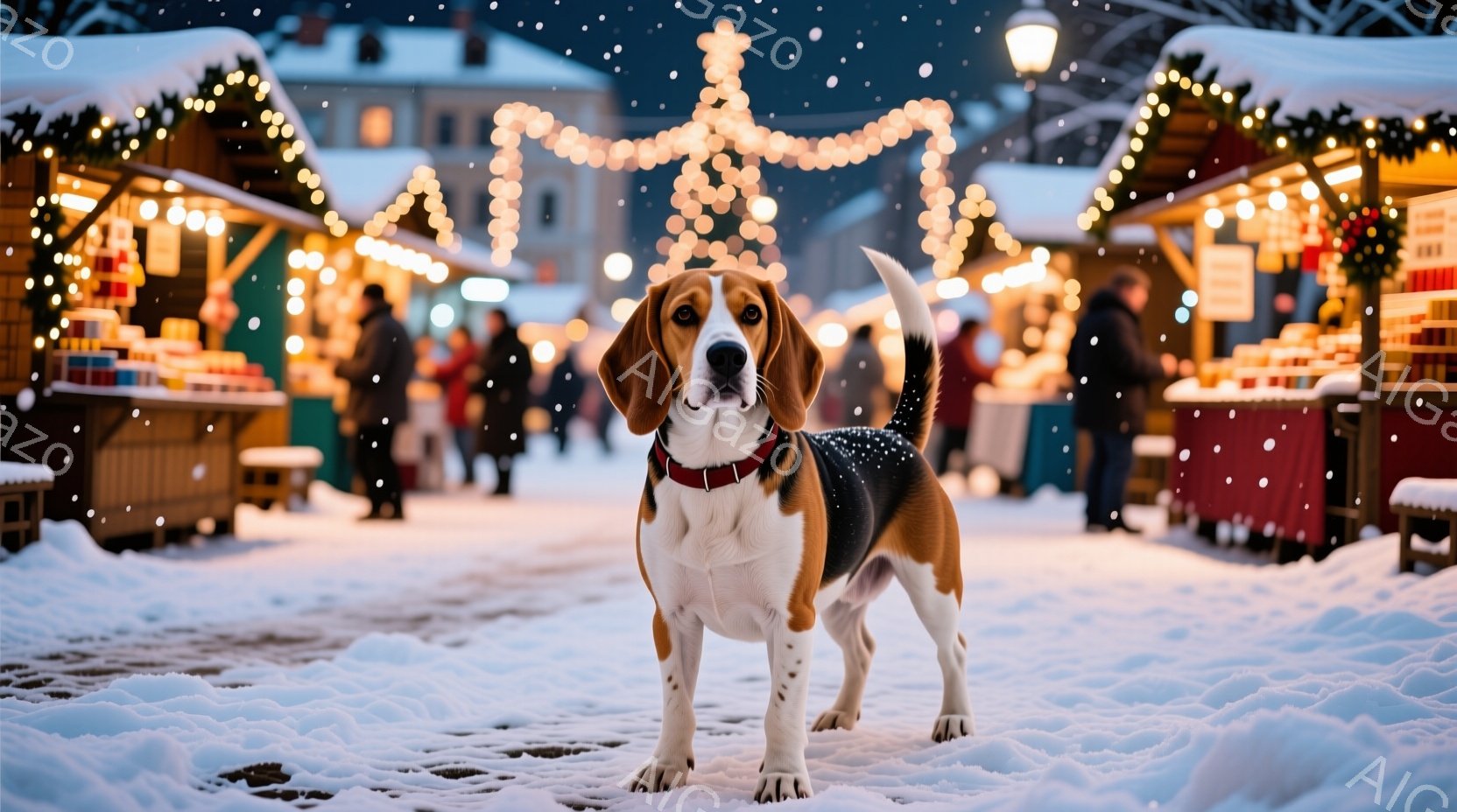 白い雪に覆われた石畳の道に、ビーグル犬が立っている。犬は茶色と白の毛並みで、首輪をつけている。背景にはクリスマスのイルミネーションが輝き、マーケットの屋台が並び、冬の華やかな雰囲気を醸し出している。