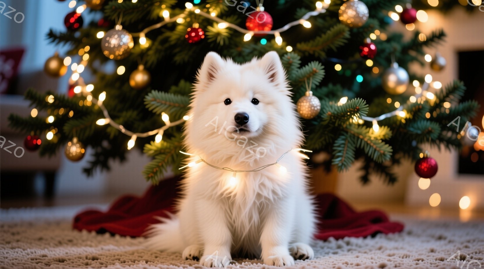 ふわふわの白い犬が、クリスマスツリーの前に座っています。犬は光る飾り付けを首に巻いており、少し伏し目がちで穏やかな表情をしています。背景には赤い布とプレゼントの箱があり、温かくお祝いムードに満ちた雰囲気です。