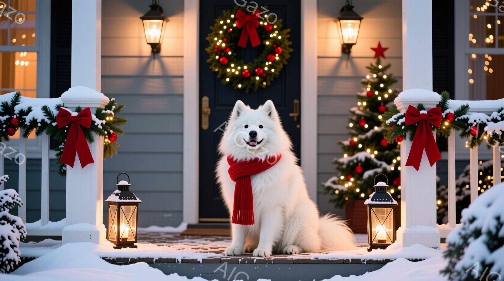 白い毛並みの大型犬が、雪景色の中に飾られたクリスマスツリーの傍らに凛々と立っている。背景には、温かい光を灯した家が見え、雪で覆われた庭とフェンスが広がり、冬の静寂と温かさを感じさせる。ツリーはカラフルなオーナメントと電飾で飾られ、雪景色の中で一層輝きを増している。