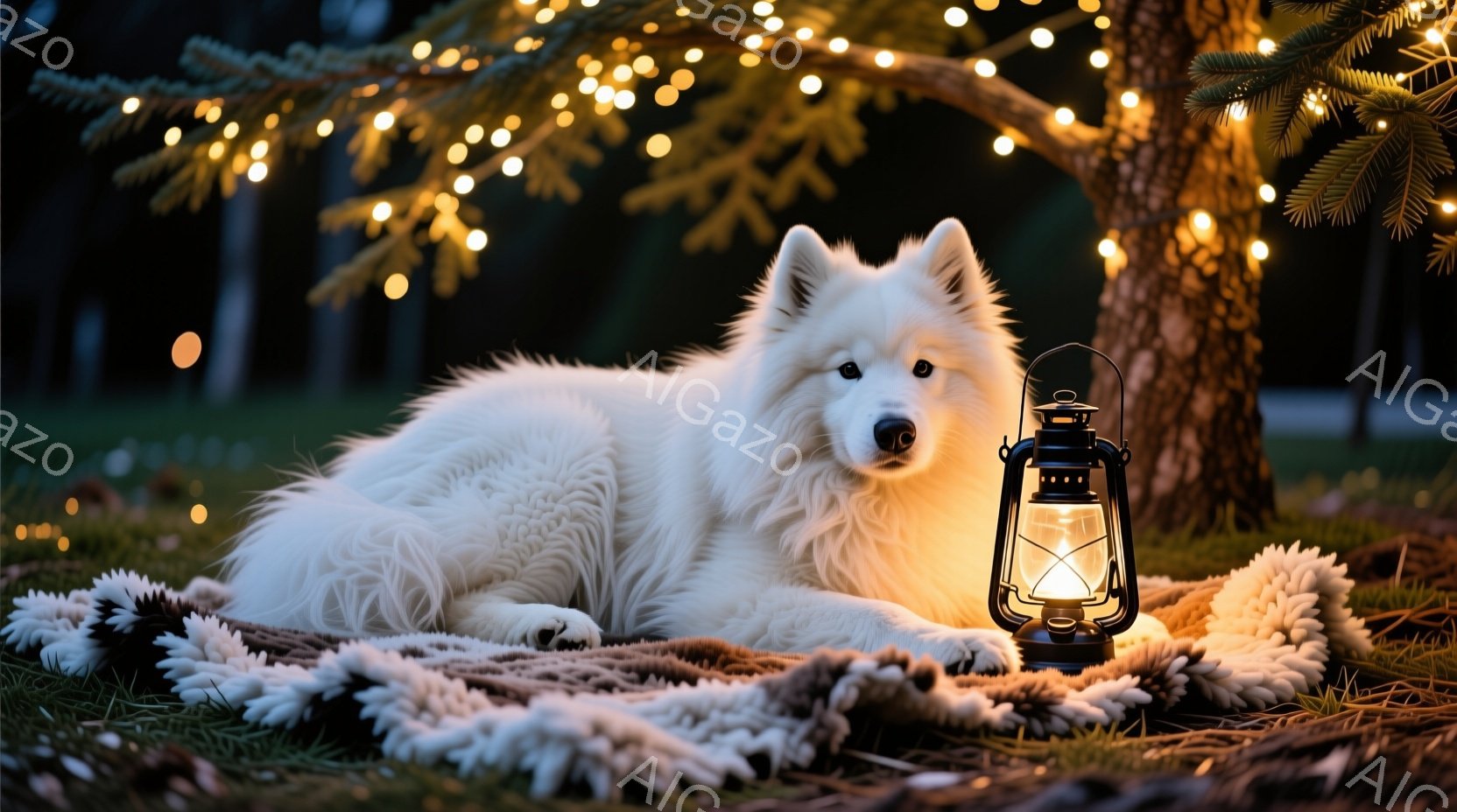 白い毛並みの大型犬が、まるで毛布のように敷かれた地面にゆったりと横たわっています。犬の隣には、温かい光を放つランタンが置かれ、周囲の落ち葉と相まって、秋の夜の穏やかな雰囲気を醸し出しています。背景にはぼやけた木々があり、頭上には小さな電球が飾られ、ロマンチックで心地よい光が犬を包み込んでいます。