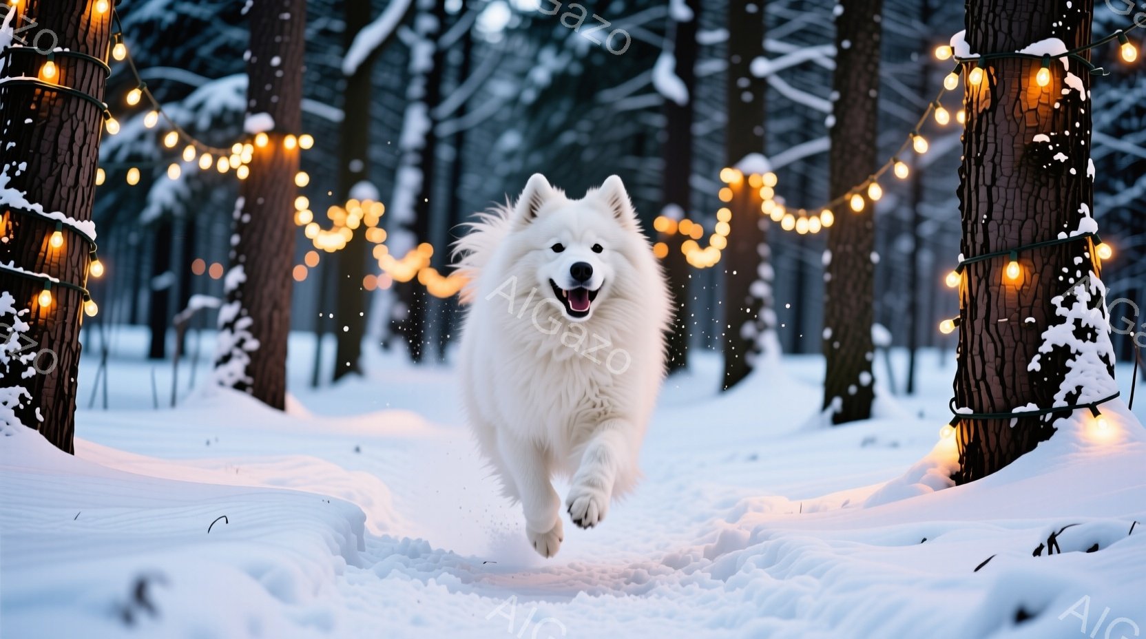 白い毛並みの大型犬が雪の中を勢いよく駆け抜けている。犬の首にはイルミネーションが飾られており、冬の森の雰囲気を明るく演出している。背景には雪に覆われた木々が立ち並び、犬の躍動感と静寂な雪景色が対照的な、暖かい雰囲気の画像である。