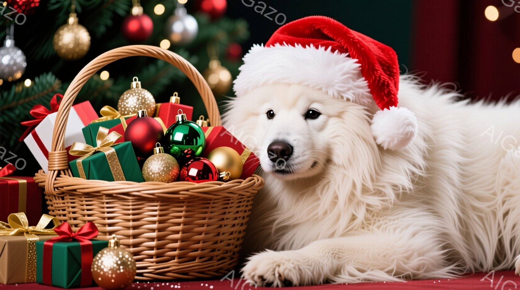 白い毛並みの大型犬が、赤いサンタ帽を被って床に横たわっています。隣には、緑と金の包装紙で飾られたプレゼントとオーナメントが詰まったバスケットがあり、背景にはクリスマスツリーの光がぼんやりと見えます。全体的に暖かく、お祝いムードに満ちたクリスマスの雰囲気が漂っています。