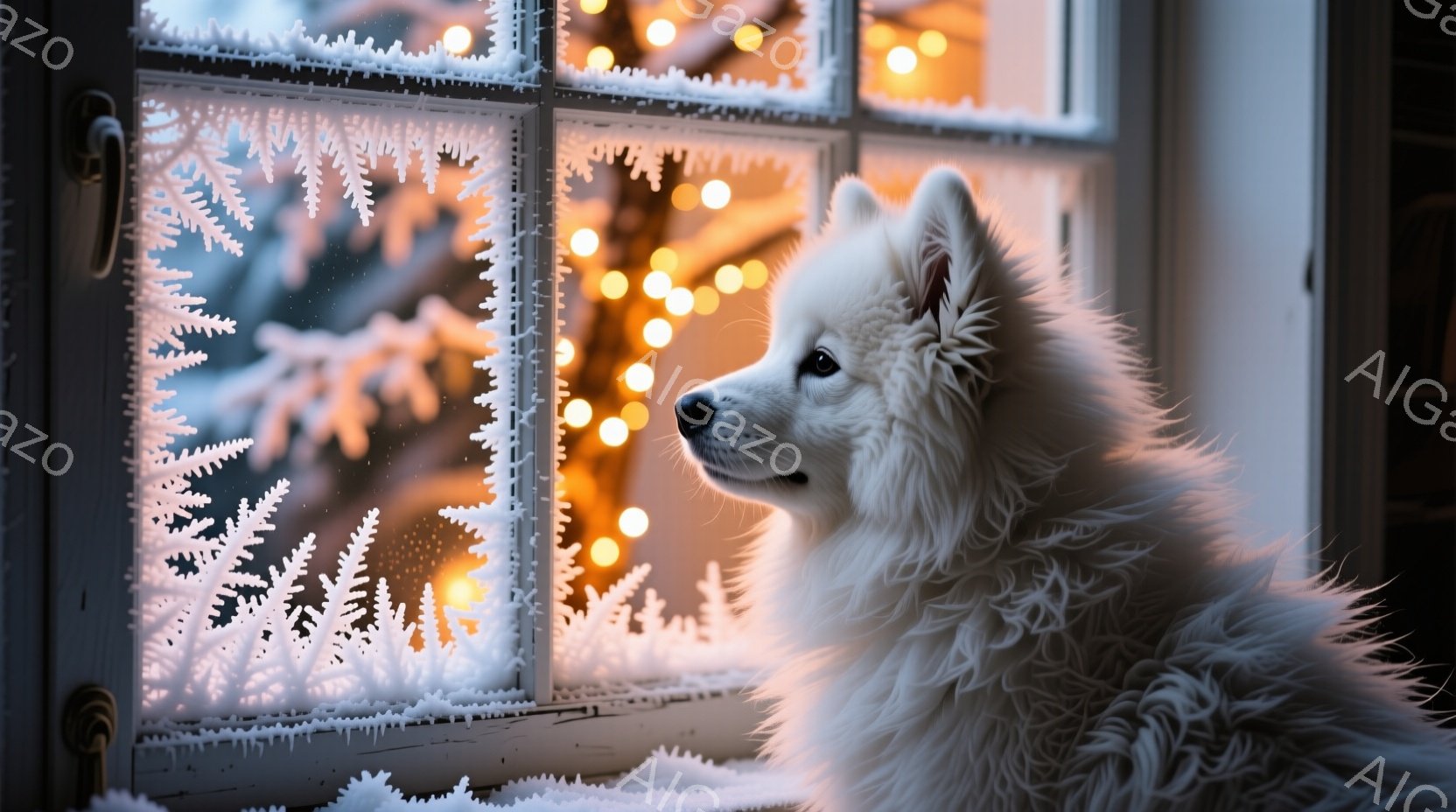 白い毛並みの犬が、霜で覆われた窓枠に寄り添い、外を眺めている。背景にはぼやけたクリスマスツリーの光が暖かく輝き、雪が降る冬の静かな風景が広がっている。犬は少し物憂げな表情で遠くを見つめ、心安らぐ穏やかな雰囲気を醸し出している。