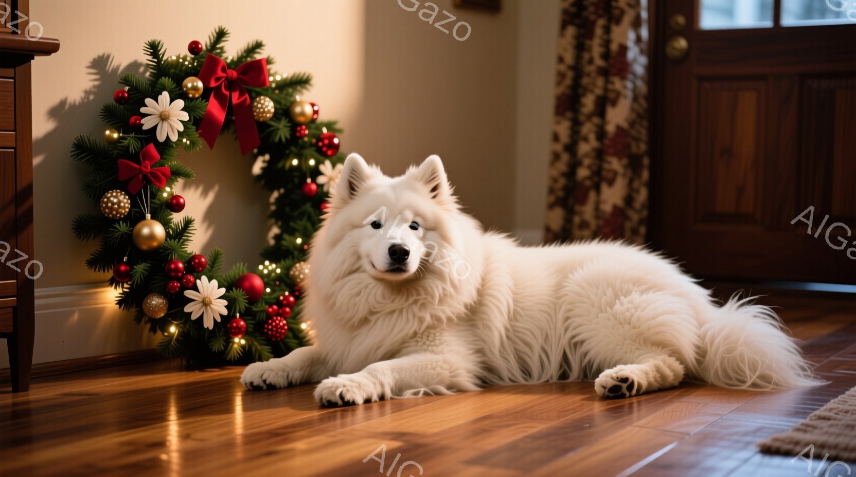 白い毛並みの大型犬が木製の床に横たわっており、穏やかな表情で正面を見つめています。背景には、赤いリボンと装飾が施されたクリスマスツリーがあり、暖かくお祝いムードの室内が広がっています。床は光沢があり、部屋全体が温かい光に包まれて、リラックスした雰囲気を醸し出しています。