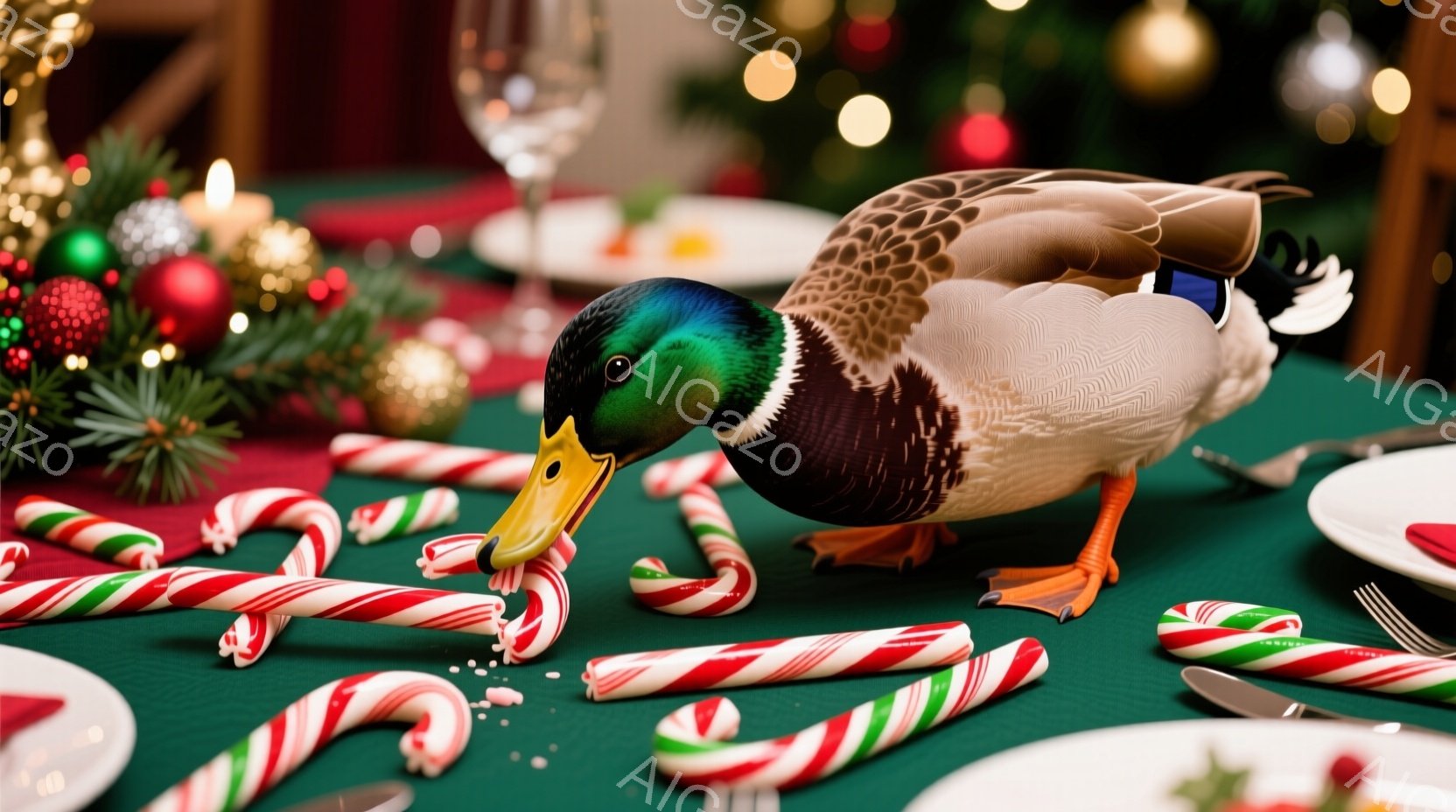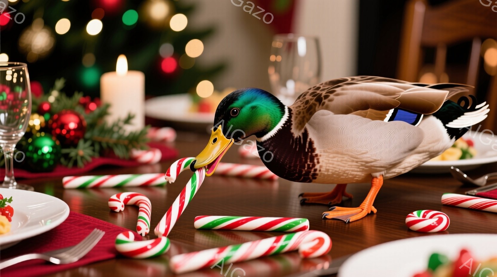 テーブルの上には、赤と白のキャンディケーンが散らばり、クリスマスの飾り付けが施されています。一羽のアヒルがキャンディケーンをくちばしで咥え、他のキャンディケーンの周りを歩いています。背景はぼやけており、お祝いの雰囲気を感じさせる、暖かく楽しい光景です。