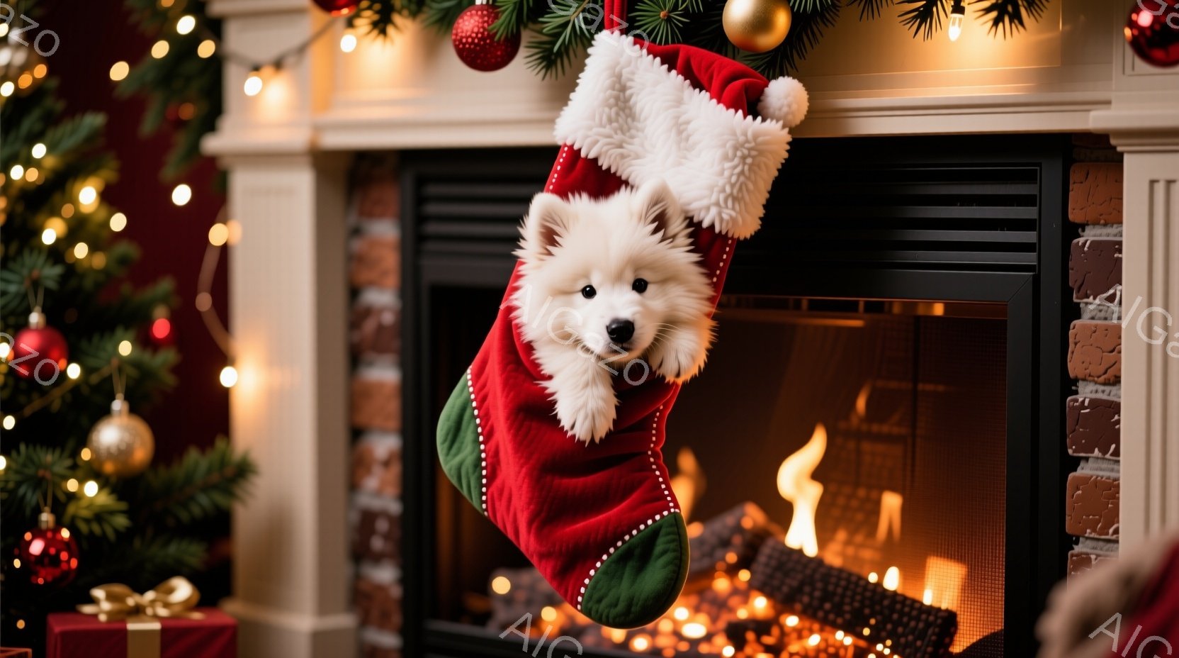 暖炉のそばに飾られた赤いクリスマスストッキングの中に、白い毛並みの幼い犬が顔を出しています。犬は好奇心いっぱいの表情で、少し上を見上げています。背景にはキラキラと輝くクリスマスツリーと、暖炉の火が暖かく灯っており、クリスマスの温かい雰囲気が漂っています。