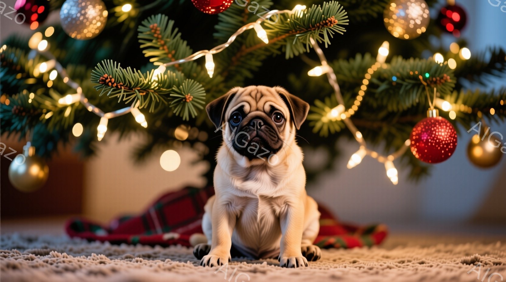 白いパグが赤い布の上に座っており、正面を見つめています。背景には、光り輝くクリスマスツリーがあり、ぼかし効果で華やかな雰囲気が強調されています。全体的に温かく、お祝いムードに満ちた一枚です。