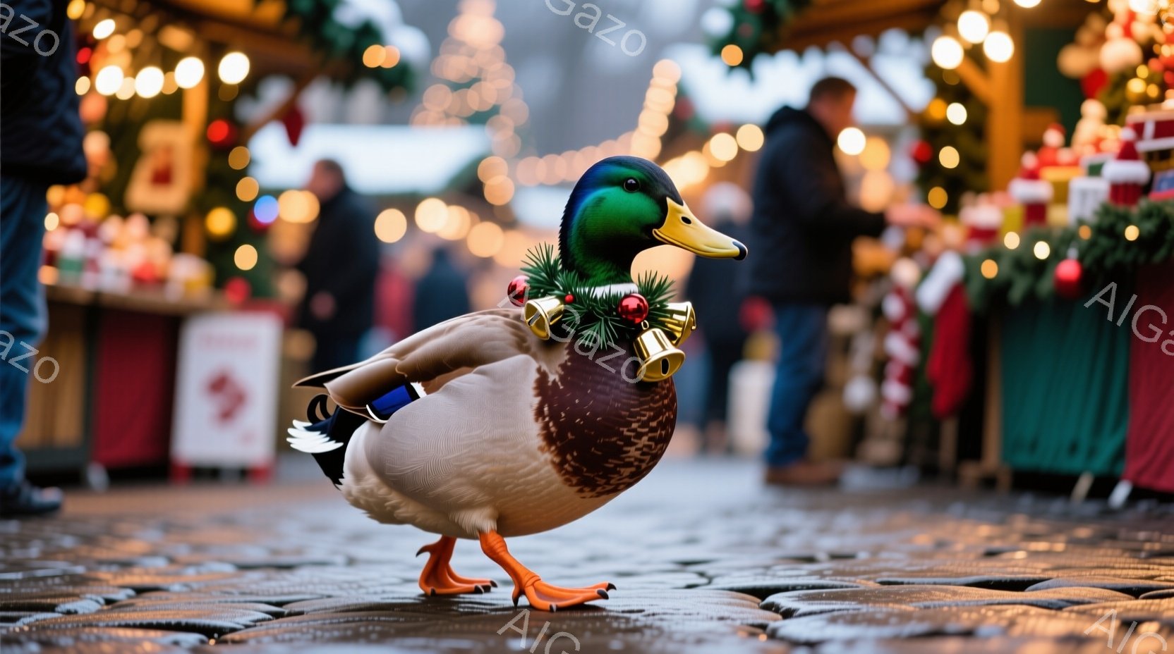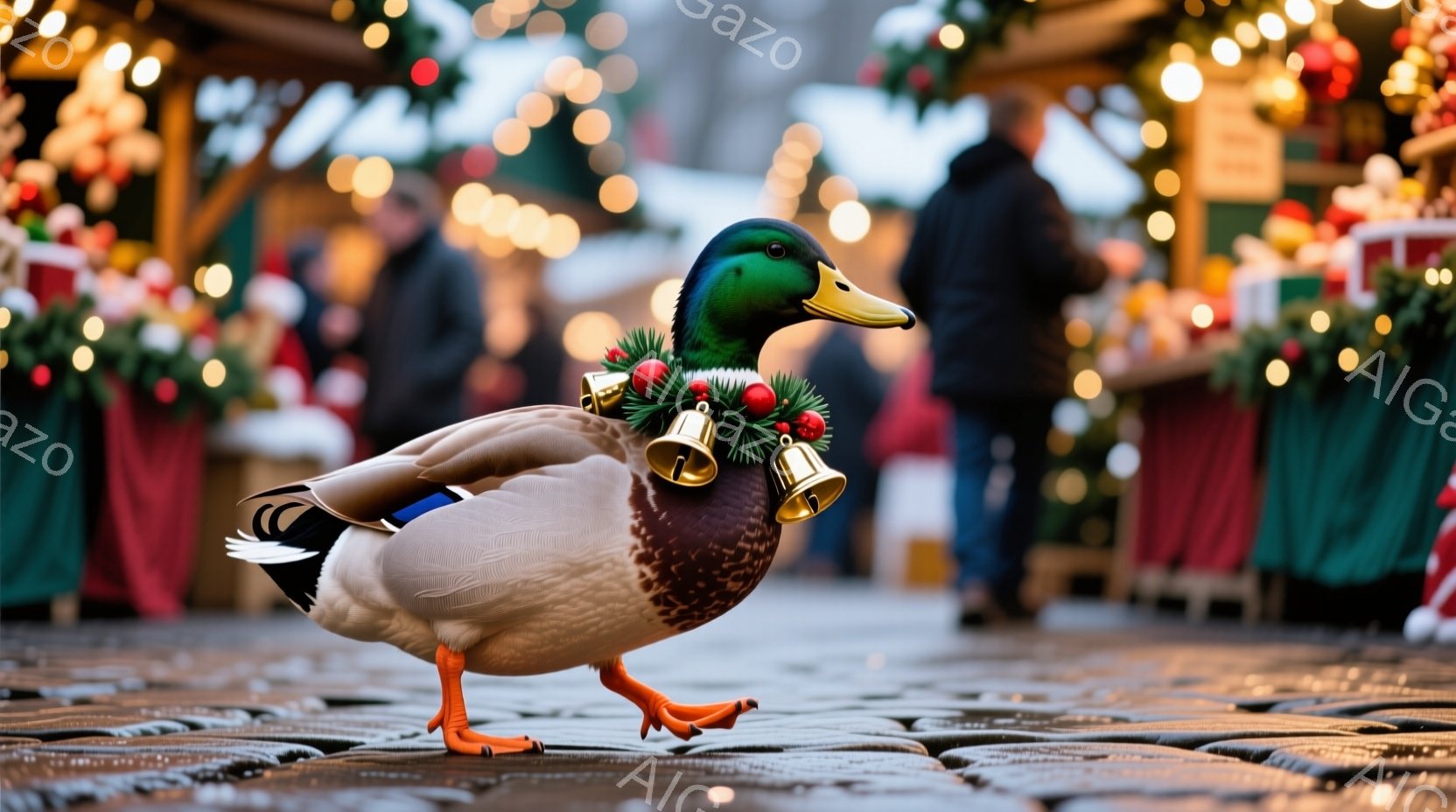 舗装された道の上を歩くアヒルの写真です。アヒルはクリスマス風の首輪と小さな鐘を身につけており、少しユーモラスな印象を与えます。背景にはぼやけたクリスマスマーケットが見え、キラキラと輝くライトと人々の姿があり、冬の祝祭の暖かく賑やかな雰囲気が漂っています。