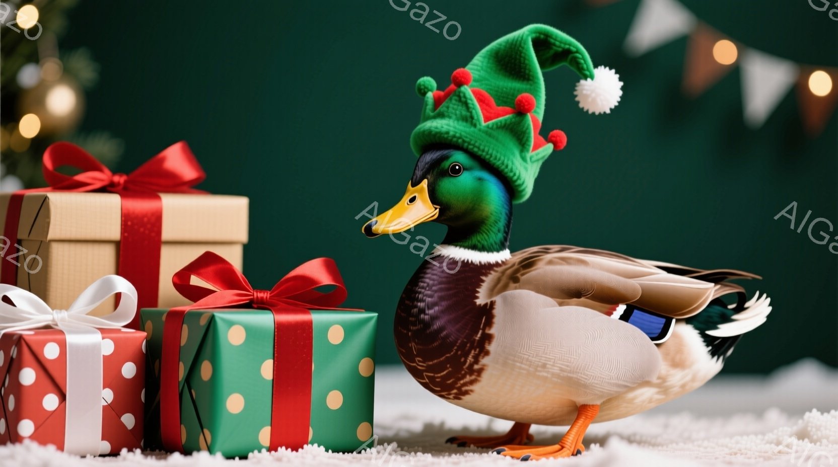 緑と赤の包装紙で包まれたプレゼントの箱がいくつか並び、その前にアヒルの鳥が立っています。アヒルは赤いサンタ帽をかぶっており、少し横を向いて、穏やかな表情をしています。背景にはクリスマスツリーが飾られ、雪が降るような白い背景が、全体に温かく、お祝いの雰囲気を醸し出しています。