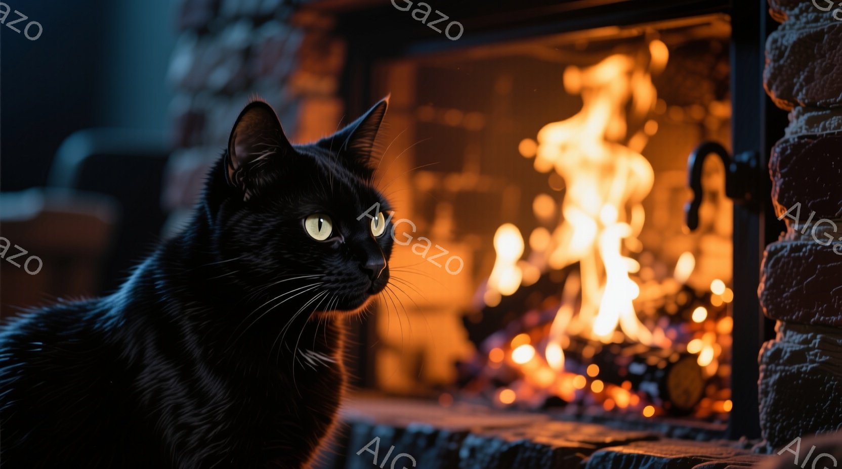 黒猫が暖炉の前に座り、少し横を向いて何かを見つめている。猫の毛並みは艶やかで、目は鮮やかな緑色をしている。背景には燃え盛る暖炉があり、暖かく心地よい雰囲気を醸し出している。