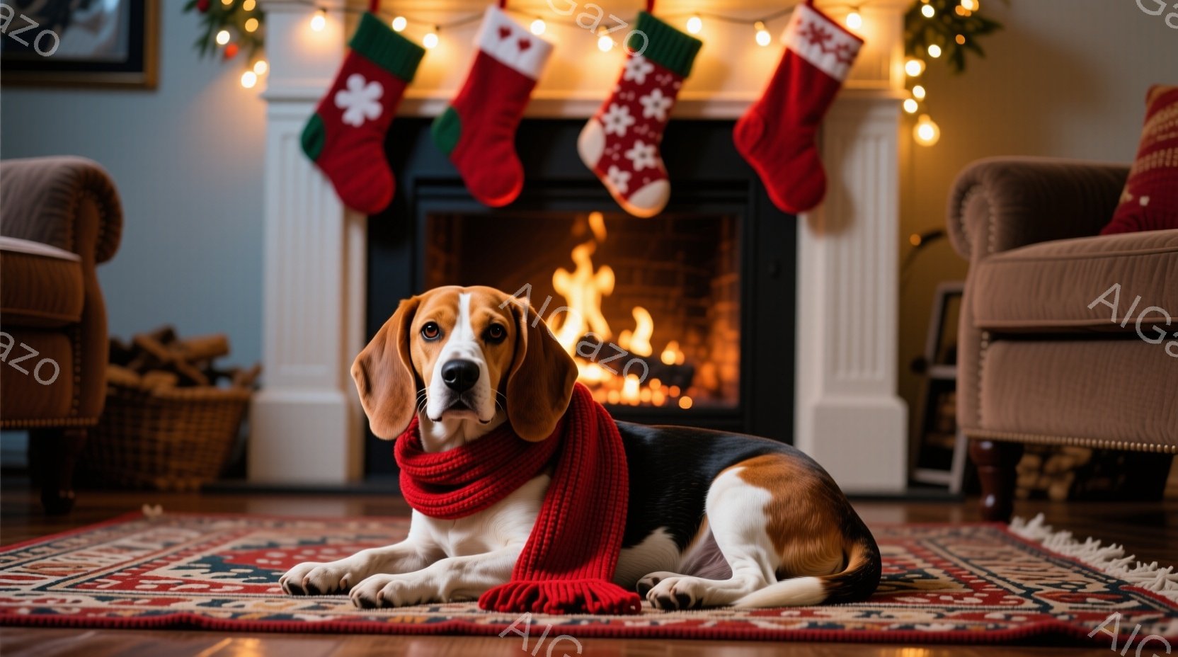 暖炉の前で首に赤いマフラーを巻いたビーグル犬がリラックスして横たわっています。背景にはクリスマスソックスが飾られ、暖炉の火が温かい光を放っています。部屋全体が心地よく、クリスマスの雰囲気に満ちています。