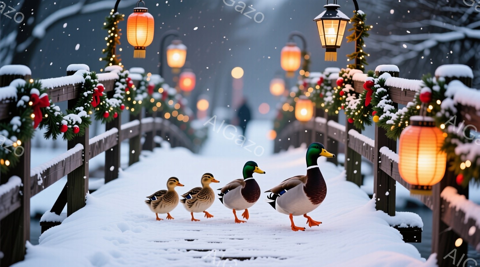雪に覆われた橋の上を、アヒルの親子が歩いている様子が描かれています。橋はクリスマス装飾で飾られ、赤いランタンと緑のリースが冬の雰囲気を高めています。雪が舞い散る中、アヒルの親子は落ち着いた様子で一列に並び、温かい光に照らされています。