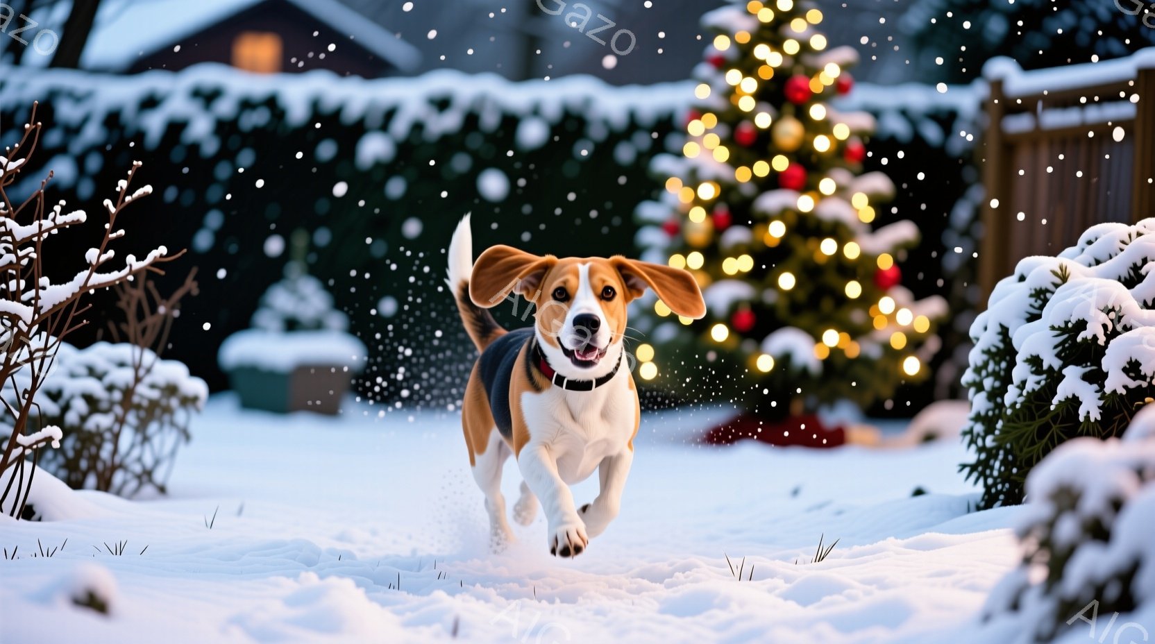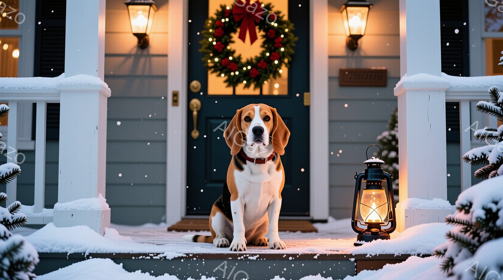 雪が降る家の玄関先に、首輪をつけたビーグル犬が座っています。犬は正面を見つめ、穏やかな表情をしています。背景にはクリスマスリースが飾られた玄関ドア、点灯したランタン、そして雪で覆われた植物が見え、温かくお祝いムードが漂っています。