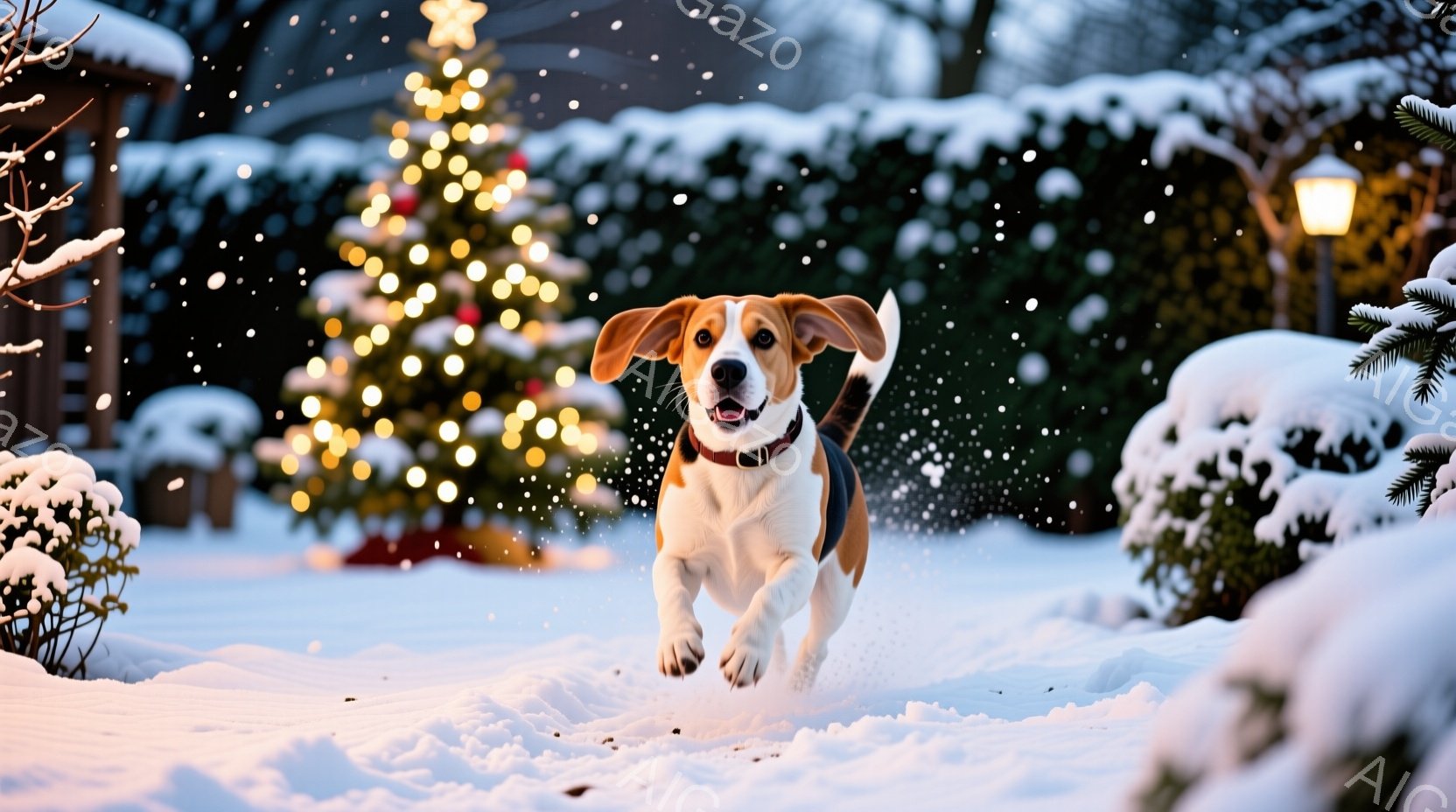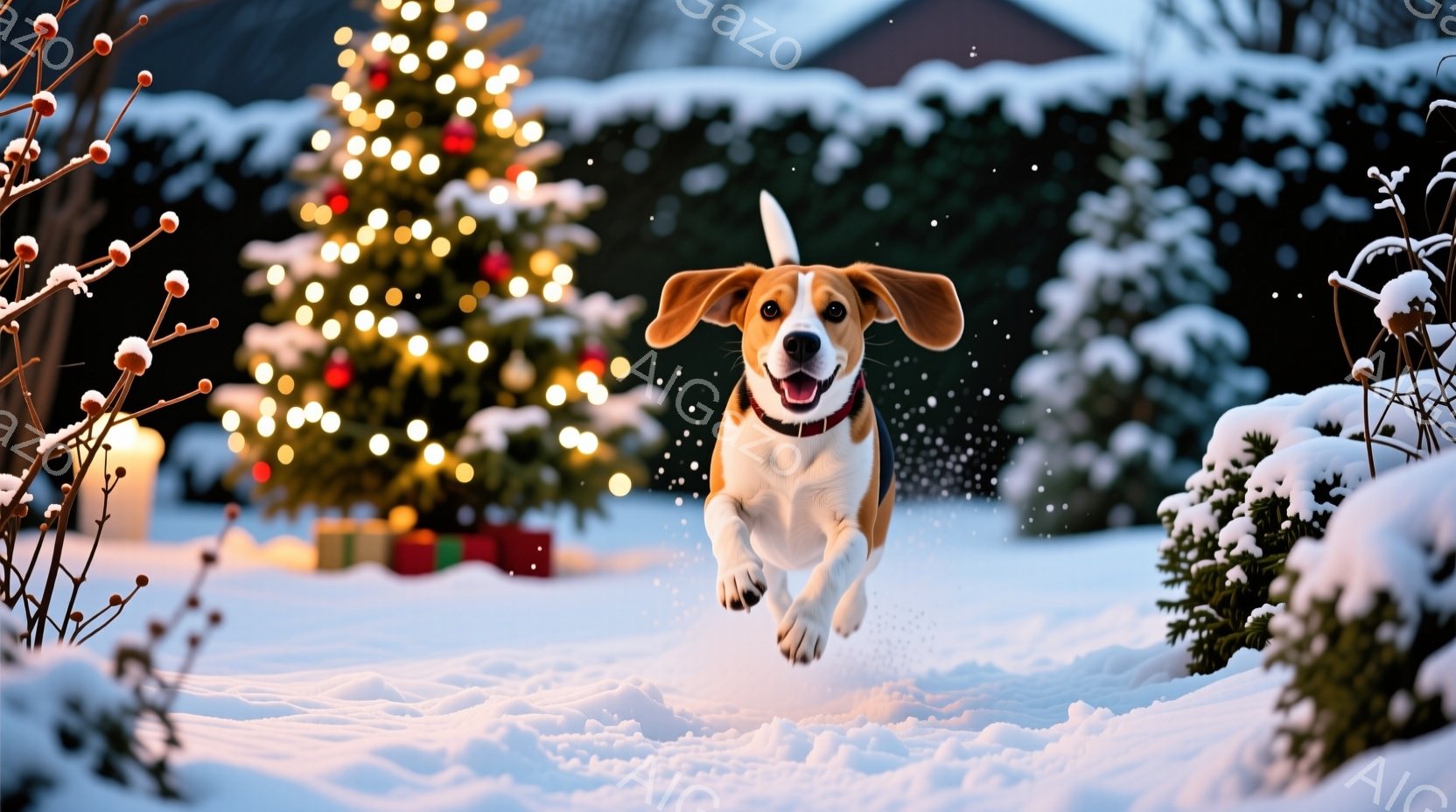 雪景色の中で、ビーグル犬が飛び跳ねて楽しそうに駆け抜けている。背景にはクリスマスツリーが輝き、雪が積もった木々が暖かな光に照らされている。全体的に、冬の喜びと活気に満ちた、心温まる雰囲気である。