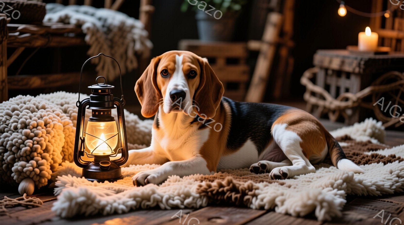 明るい茶色の毛並みを持つビーグル犬が、ふわふわの白いラグの上に横たわっています。犬は穏やかな表情で正面を見つめ、リラックスした姿勢を見せています。背景には、籐のバスケットやキャンドル、温かい光が灯るランプがあり、室内は落ち着いた雰囲気で満たされています。