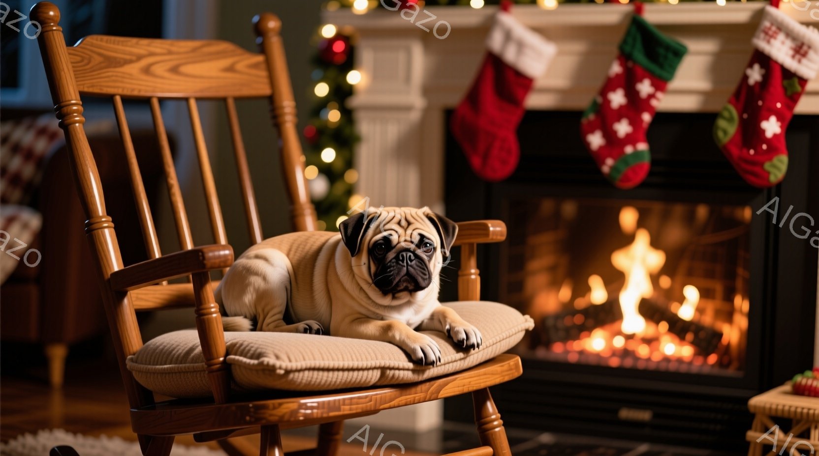 暖炉のそばにあるロッキングチェアに、愛らしいパグが座っています。パグは少し憂いを含んだ表情で正面を見つめており、ゆったりとした姿勢でリラックスしている様子が伺えます。背景にはクリスマスらしい飾り付けや暖炉の炎が映り、温かく居心地の良い雰囲気を醸し出しています。