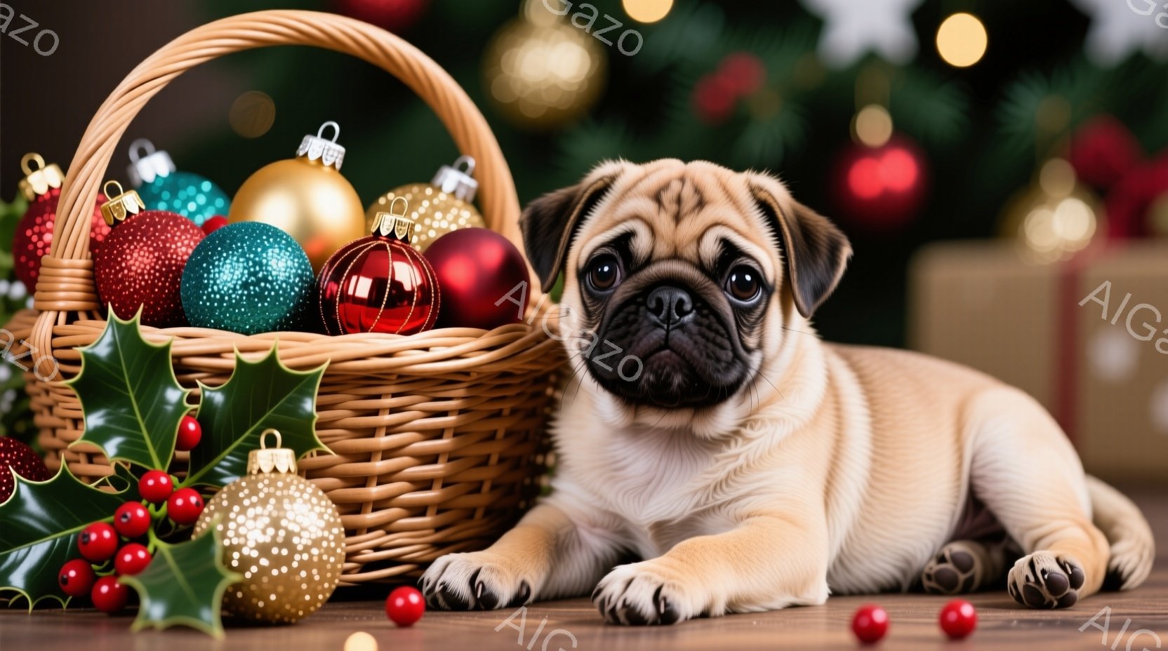 パグの子犬がクリスマスオーナメントが入ったバスケットの横に横たわっています。子犬は明るい茶色の毛並みで、少し心配そうな表情をしています。背景にはぼやけたクリスマスツリーと、木製の床が見え、全体的に温かく、お祝いの雰囲気です。
