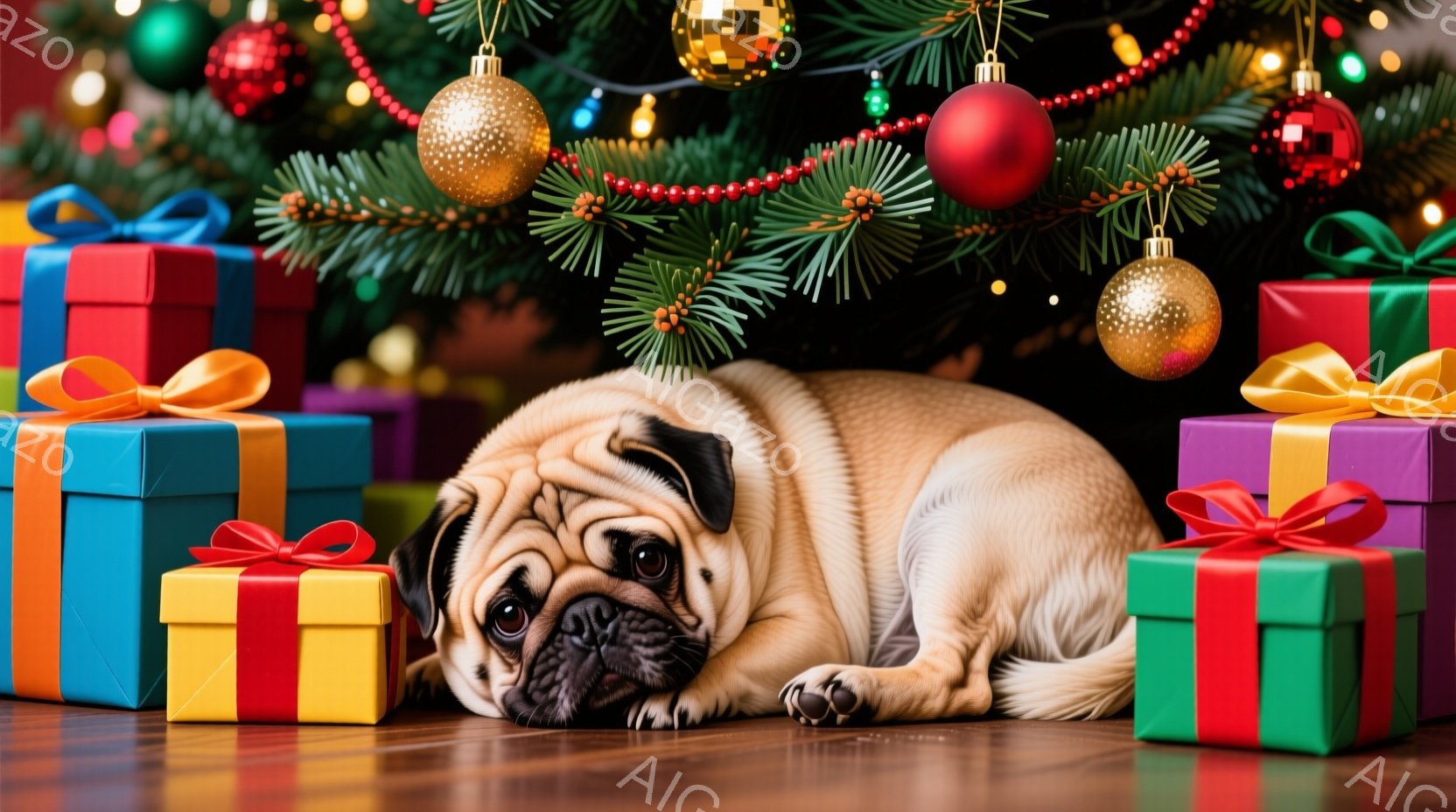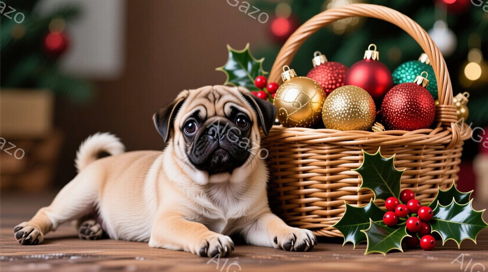 子犬のパグが木の床の上に横たわっており、隣にはクリスマスオーナメントでいっぱいのバスケットがあります。パグは茶色の毛並みで、顔は小さく、愛らしい表情をしています。背景にはクリスマスツリーとプレゼントボックスが見え、全体的に暖かく、お祝いの雰囲気です。
