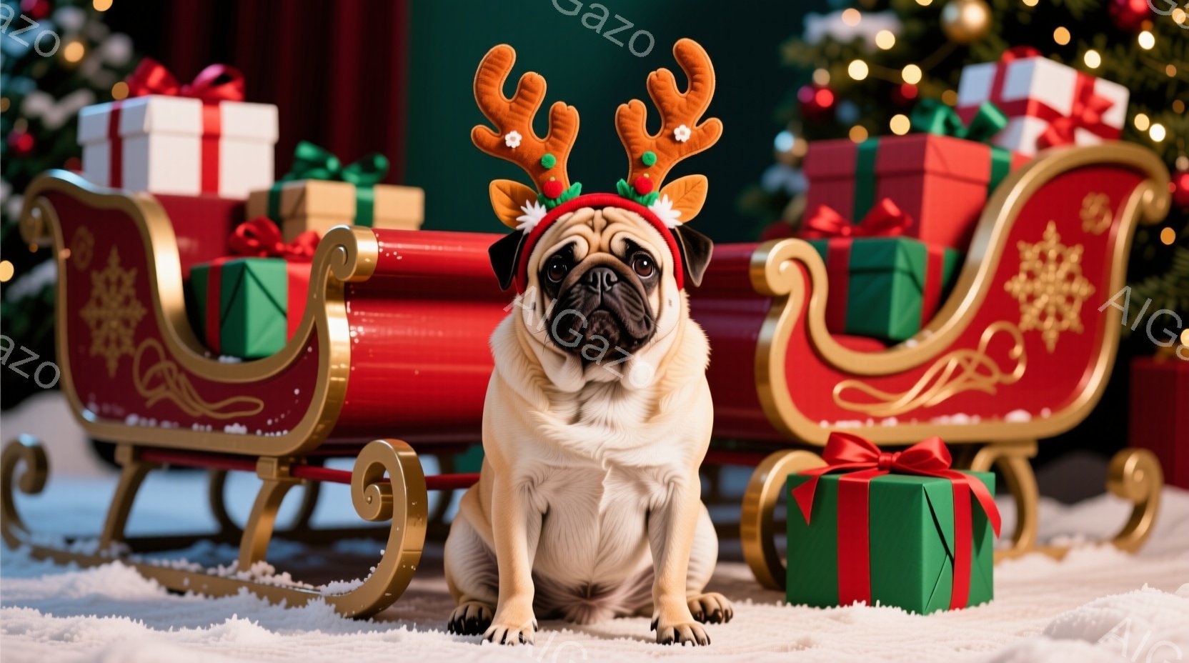 パグが頭にトナカイの角飾りをつけて座っており、少し困ったような表情をしています。背景には赤いそり、プレゼントの箱、そしてキラキラと輝くクリスマスツリーの飾りが見え、雪が敷かれた床の上に座っています。全体的に暖かく、楽しいクリスマスの雰囲気が漂っています。