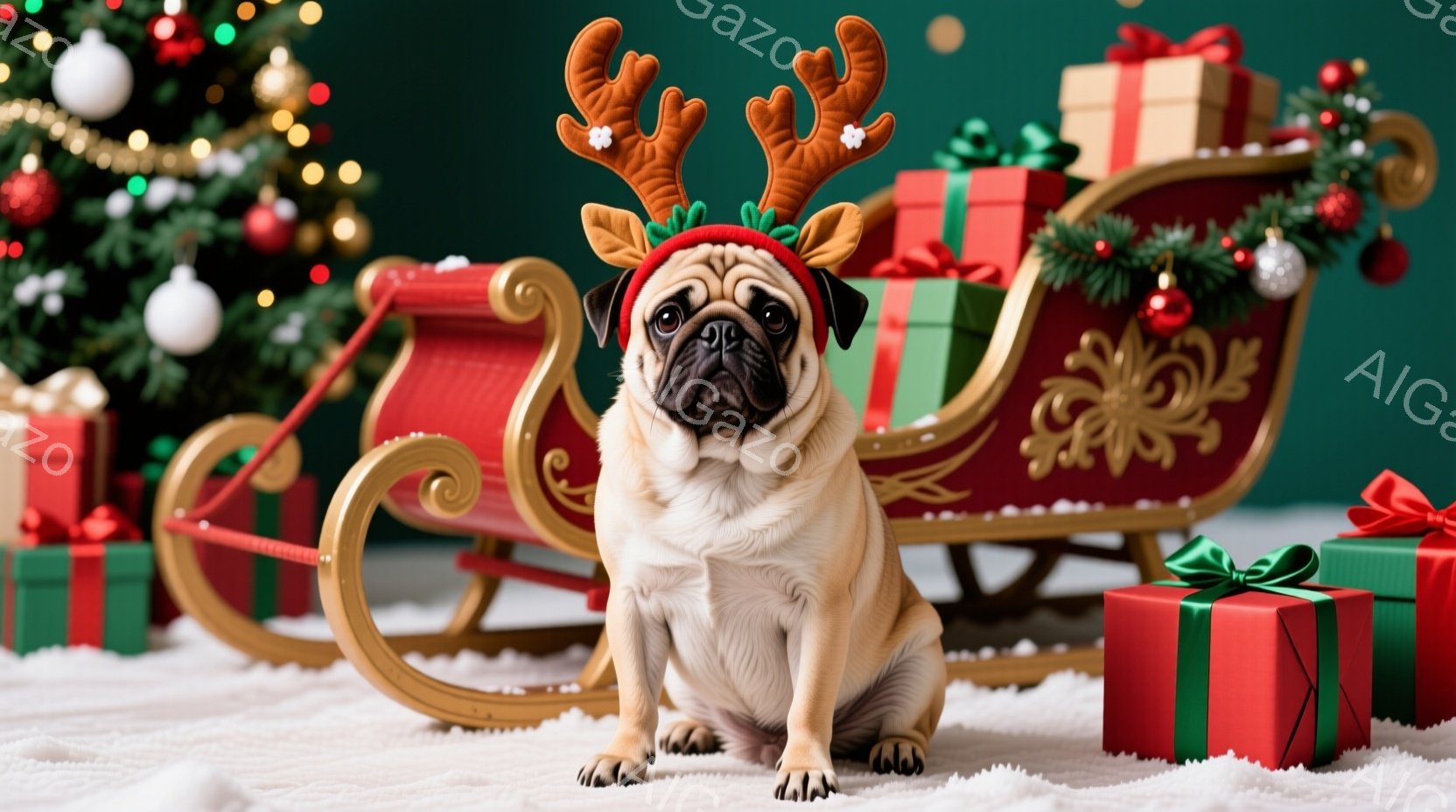 クリーム色のパグが、クリスマスらしい赤いトナカイの角飾りをつけて座っています。その前には、緑と赤のリボンで飾られたプレゼントボックスがいくつか置かれ、背景には豪華な赤いそりが飾られています。全体的に、暖かく、お祝いムード満点のクリスマスの雰囲気が漂っています。