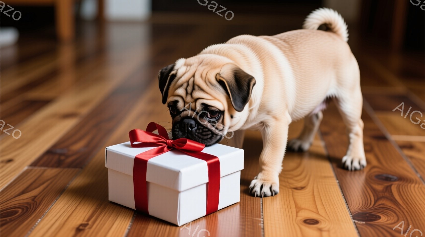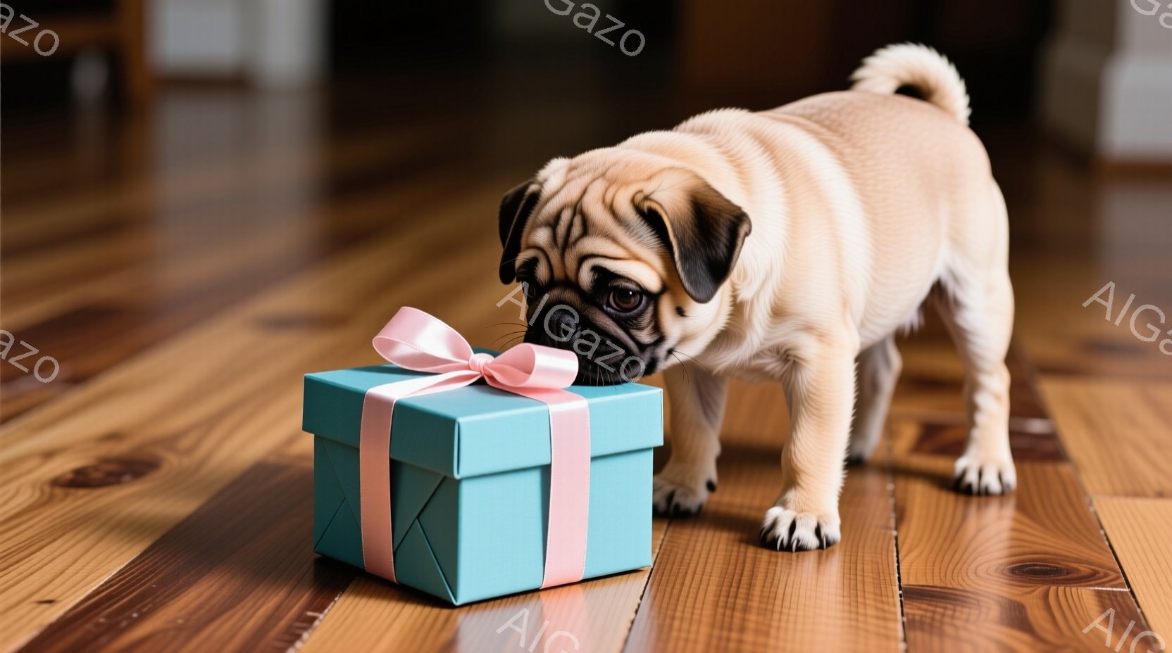 暖かな木製の床の上に、茶色のリボンで結ばれた茶色のギフトボックスが置かれています。子犬のパグが鼻をギフトボックスに近づけ、興味津々な表情で匂いを嗅いでいます。背景はぼかされており、暖かい室内であることがわかります。