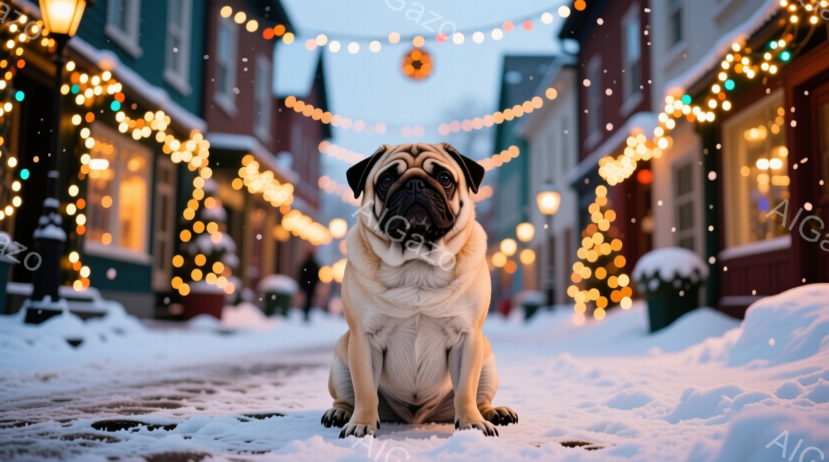 雪が降る街中に、愛らしいパグが座っています。パグは穏やかな表情で正面を見つめており、周囲の暖かい光と雪景色がその可愛らしさを引き立てています。背景には、イルミネーションで飾られた建物が並び、冬の暖かく幻想的な雰囲気が漂っています。