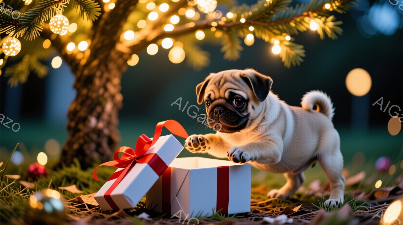 小さなパグの子犬が、リボンのかかった青いギフトボックスに手を伸ばしています。背景にはクリスマスツリーが輝き、周りにはプレゼント箱が散らばっており、温かくお祝いムードに包まれています。緑の草の上で、可愛らしいパグがプレゼントに夢中になっている様子が捉えられています。