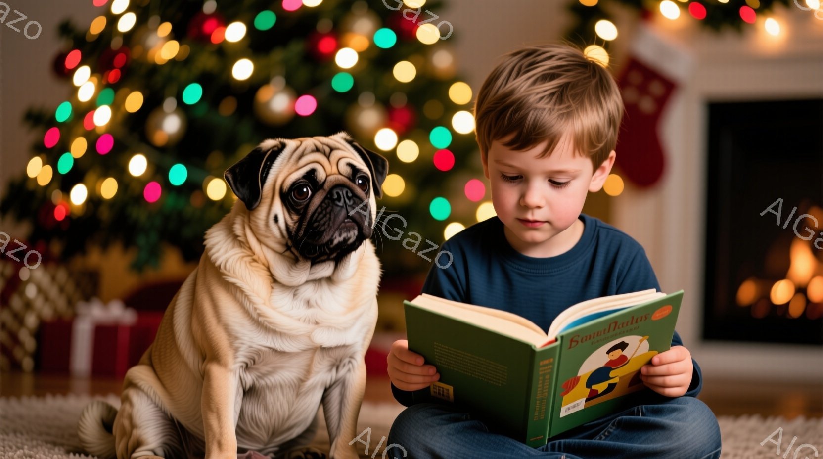 愛らしいパグの子犬が、赤いリボンで飾られた青いギフトボックスから顔を出しています。背景には、緑の芝生と、ぼんやりとしたクリスマスツリーの光が散りばめられており、他に赤いギフトボックスがいくつかあります。全体的に、喜びと期待感に満ちた、お祝いの雰囲気が漂っています。