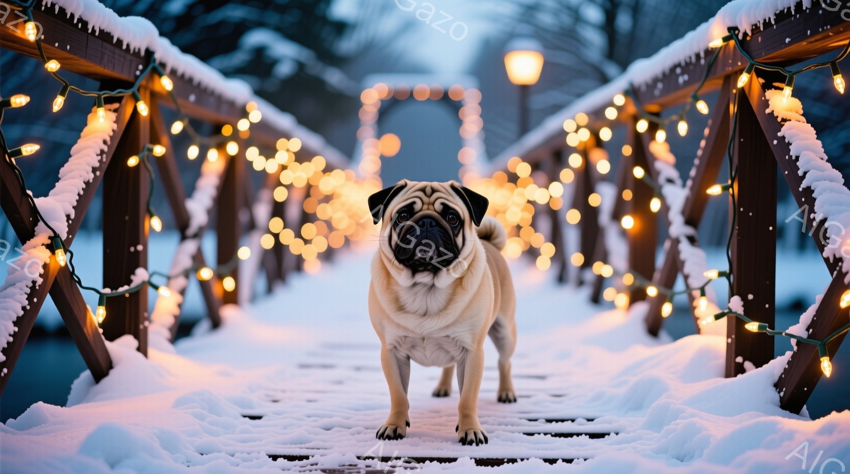 パグが雪に覆われた橋の中央に立っている。周りの柵には温かい光を放つ電飾が飾られ、雪景色と相まって幻想的な雰囲気を醸し出している。パグは正面を向き、少し困ったような表情でこちらを見ている。