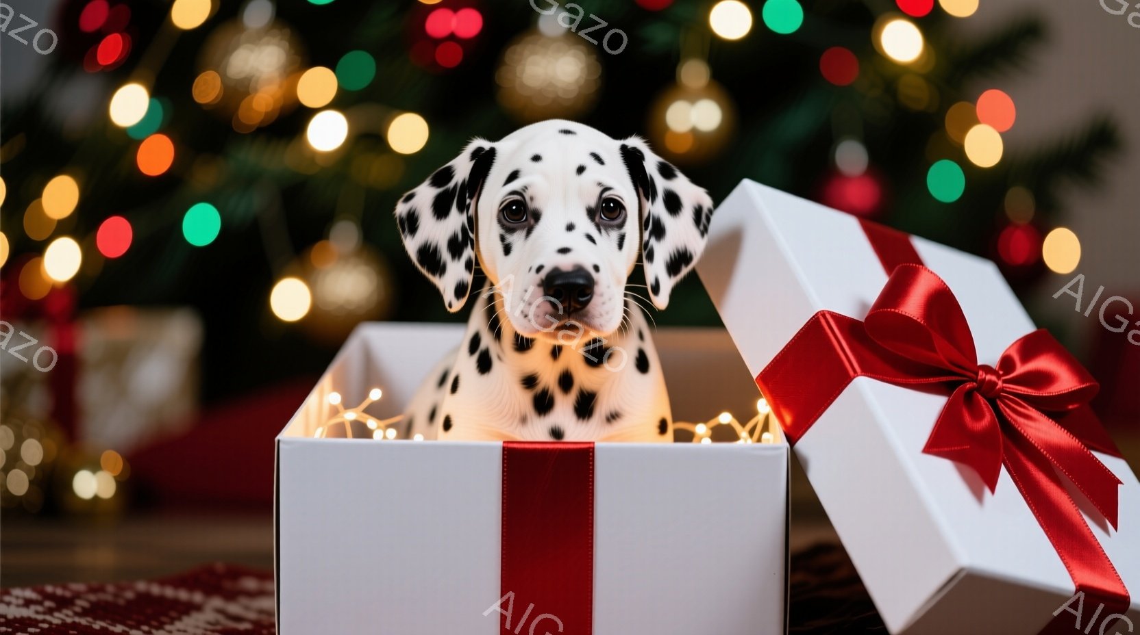 白地に黒い斑点模様のダルメシアンの子犬が、赤と金色のリボンで飾られたプレゼントボックスの中に座っています。背景には、ぼやけたクリスマスツリーのライトが見え、お祝いムードを演出しています。全体的に、可愛らしくて温かい雰囲気の画像です。