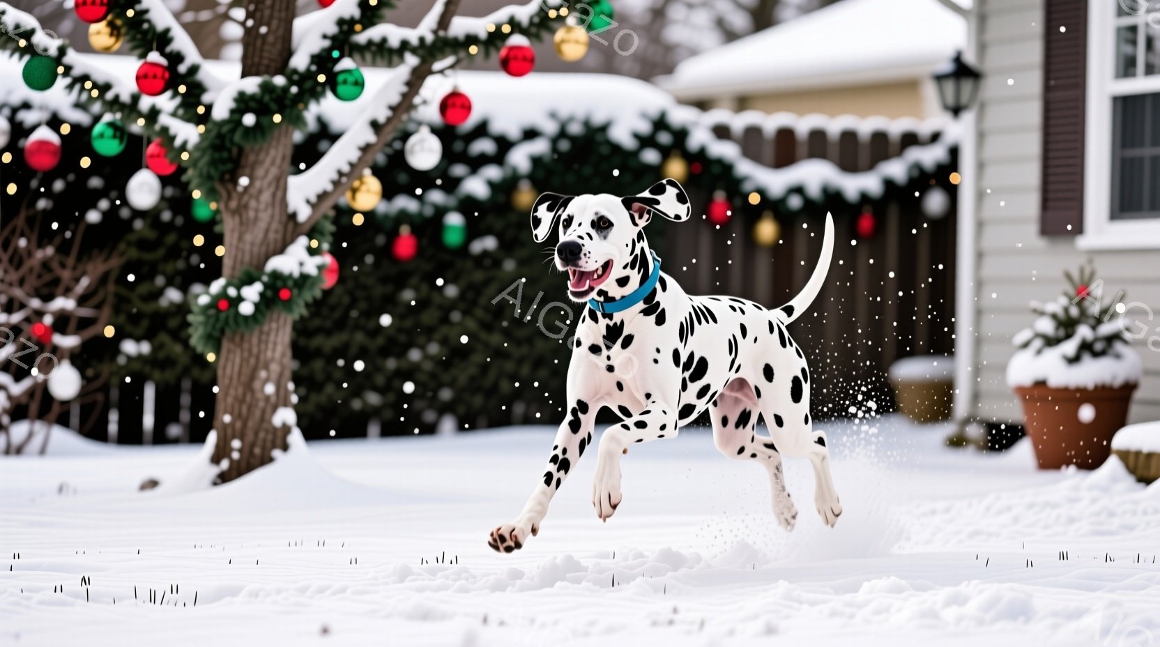 白地に黒い斑点模様のダルメシアンが、雪で覆われた家のポーチの階段に立っている。クリスマスのリースが飾られた正面玄関と、点灯したクリスマスツリーが背景にあり、暖かな光がダルメシアンを照らしている。雪が降り積もり、ポーチの手すりにも積雪が見られ、冬の穏やかな祝祭の雰囲気が漂っている。