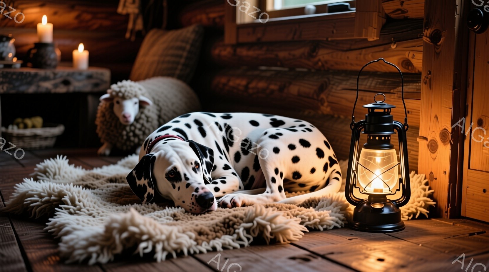 斑点模様のダルメシアン犬が、木の床に敷かれた毛皮のような敷物の上で横たわっています。背景には木製の壁とドアがあり、オイルランタンが犬の横で温かい光を放っています。全体的に暖かく居心地の良い、静かな空間の雰囲気が漂っています。