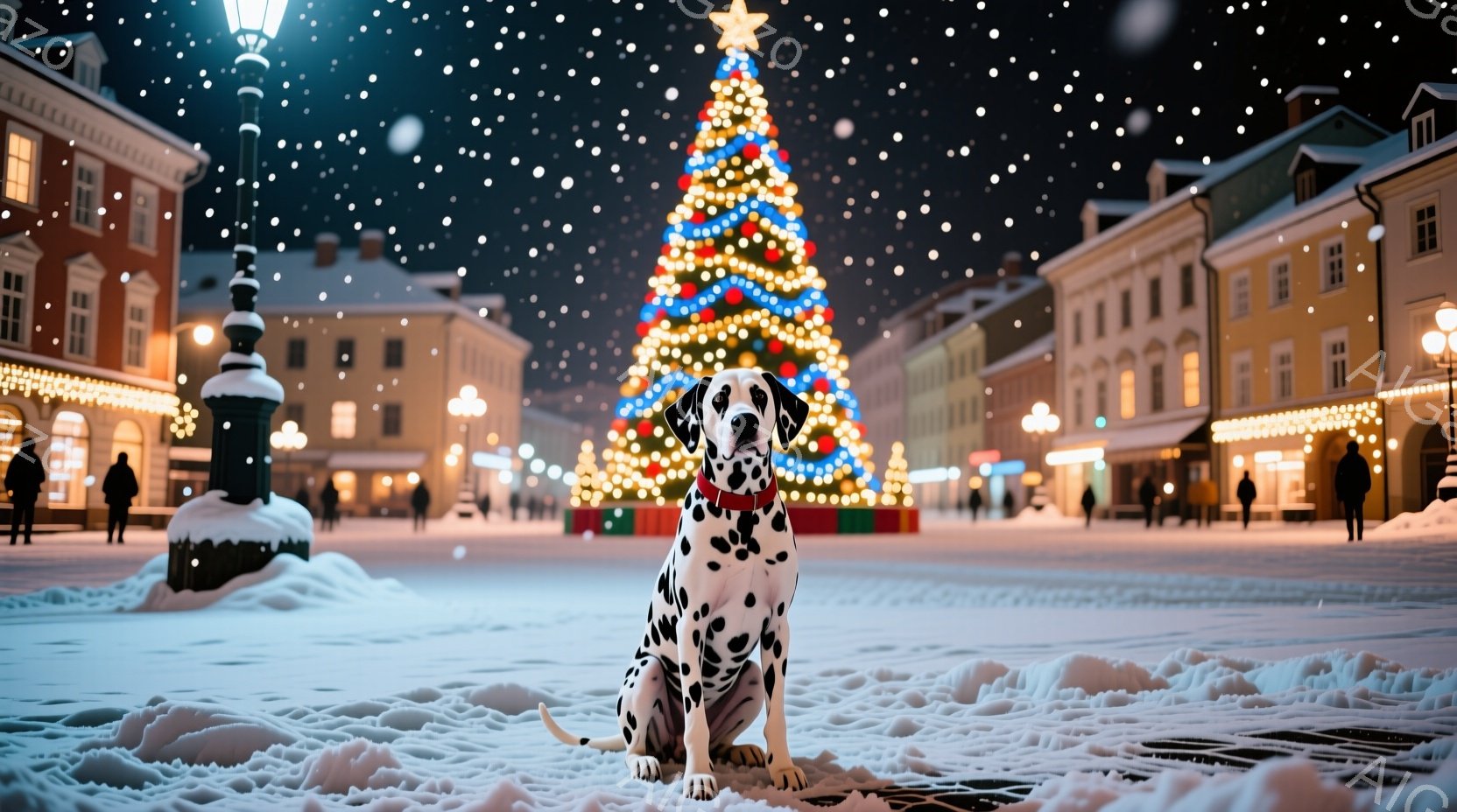 雪が降り積もる夜の街並みを背景に、2匹のダルメシアンが座っています。片方のダルメシアンは赤い首輪、もう片方は緑色の首輪をつけており、それぞれ前方をまっすぐ見つめています。背景には、きらびやかなクリスマスツリーやライトアップされた建物が並び、冬の暖かく幻想的な雰囲気が漂っています。