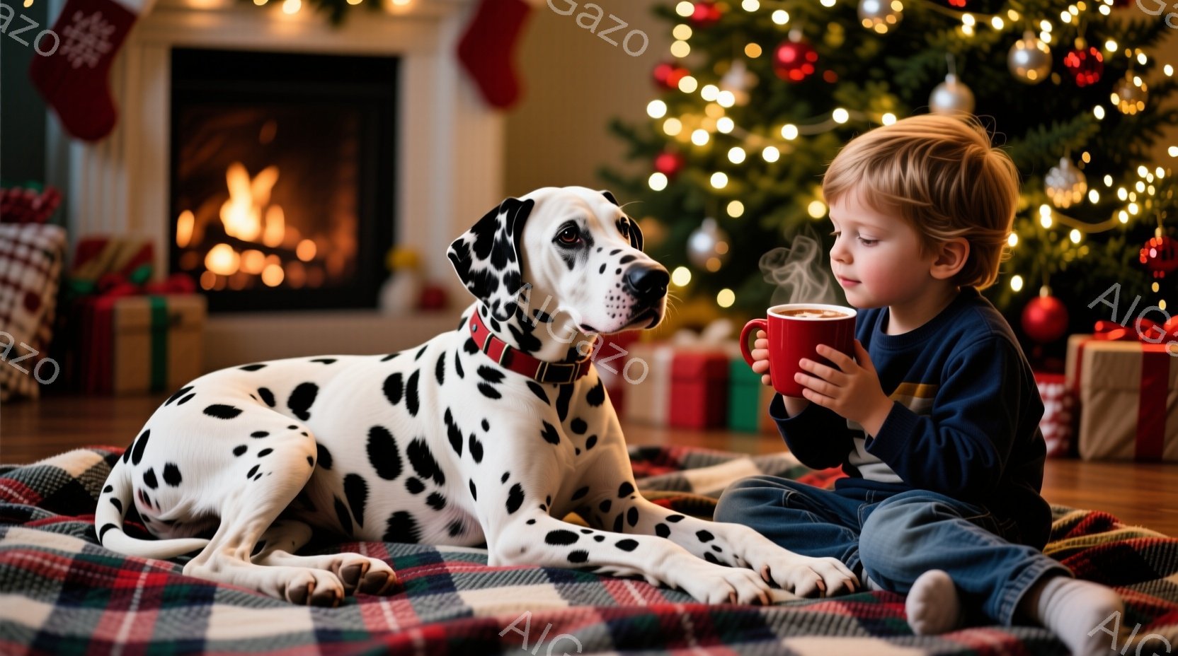 少年はチェック柄の敷物の上で正座し、片手にマグカップを持って何かを飲んでいるようです。ダルメシアンは少年の隣で横になり、リラックスした様子でこちらを見ています。背景にはクリスマスツリーやプレゼント、暖炉が見え、温かく穏やかなクリスマスの雰囲気が漂っています。