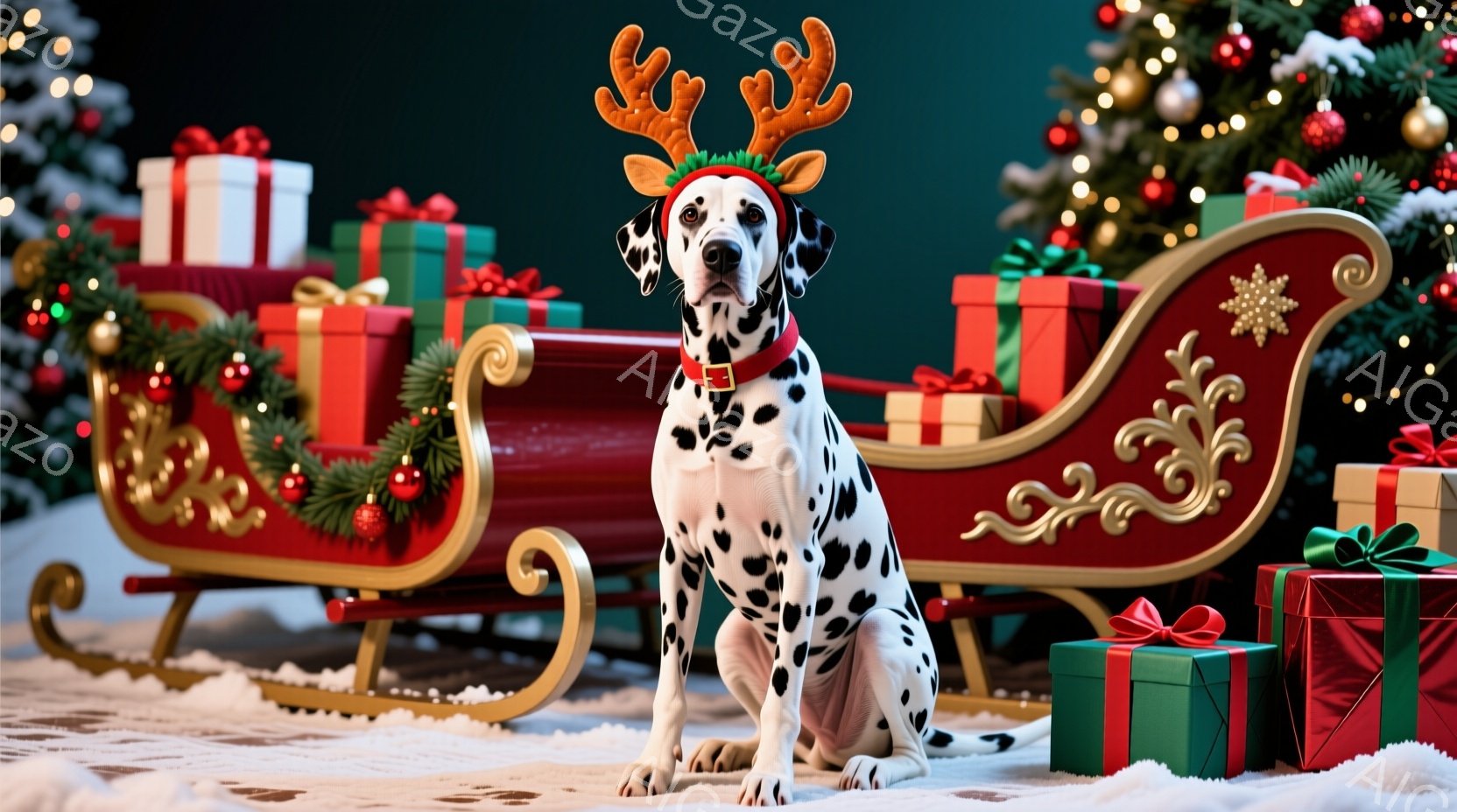 白地に黒斑のダルメシアンが、クリスマスらしい背景の前で座っています。赤いトナカイの角のヘッドバンドと赤い首輪をつけており、少し前を向いた可愛らしい表情をしています。背景には、プレゼントの山と装飾されたソリ、そしてクリスマスツリーがあり、雪が降る冬の暖かい雰囲気を醸し出しています。