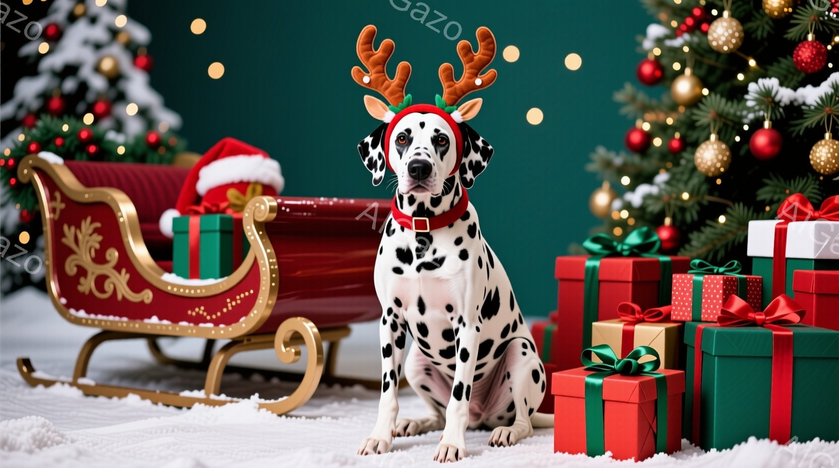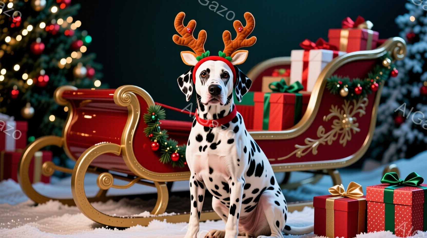 白地に黒い斑点模様のダルメシアン犬が、赤いトナカイの角の飾りを付けて雪の上に座っています。背景には、プレゼントの箱が積み重ねられた赤いそりが置かれ、緑色のクリスマスツリーが飾られています。雪が舞う冬の風景は、暖かく、お祝いの雰囲気を漂わせています。