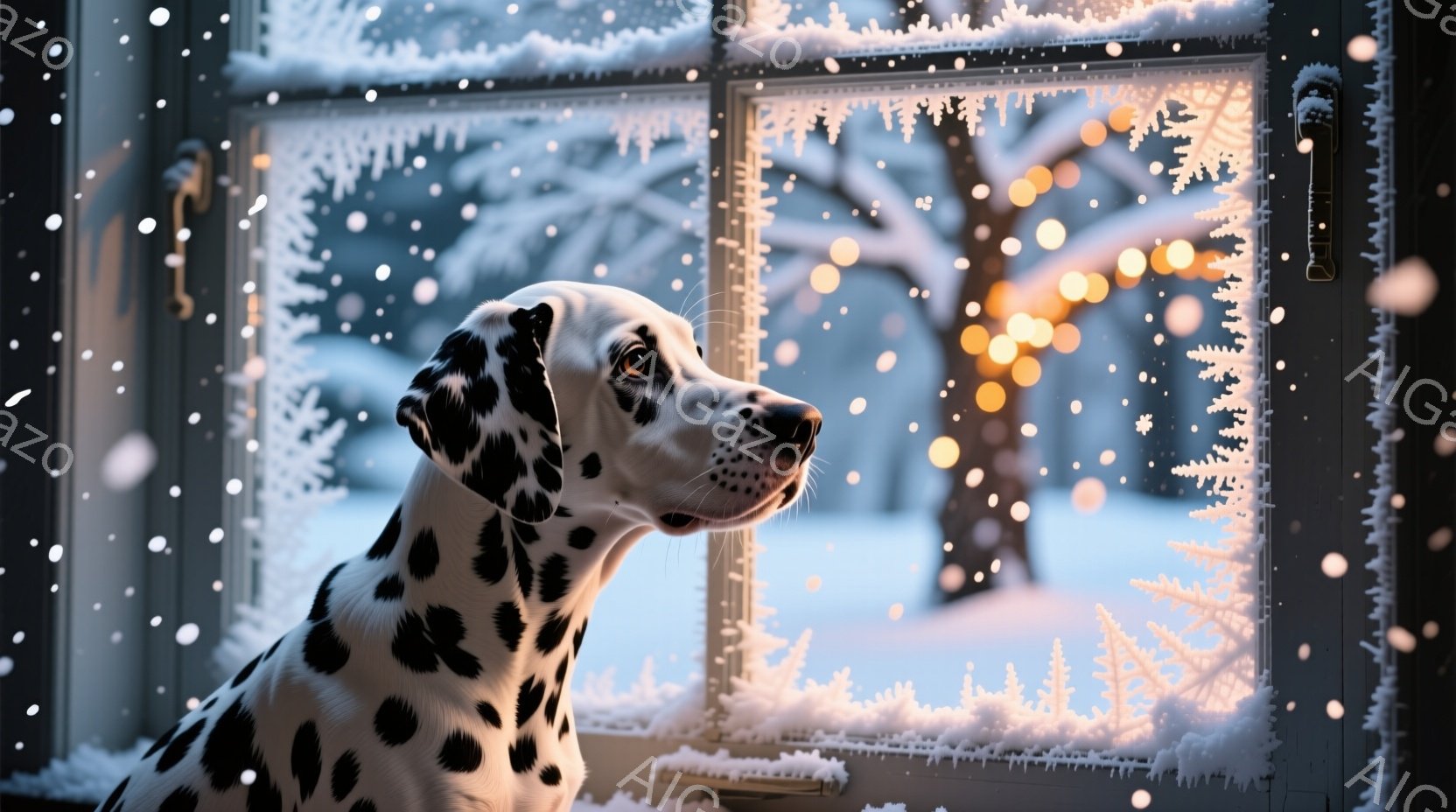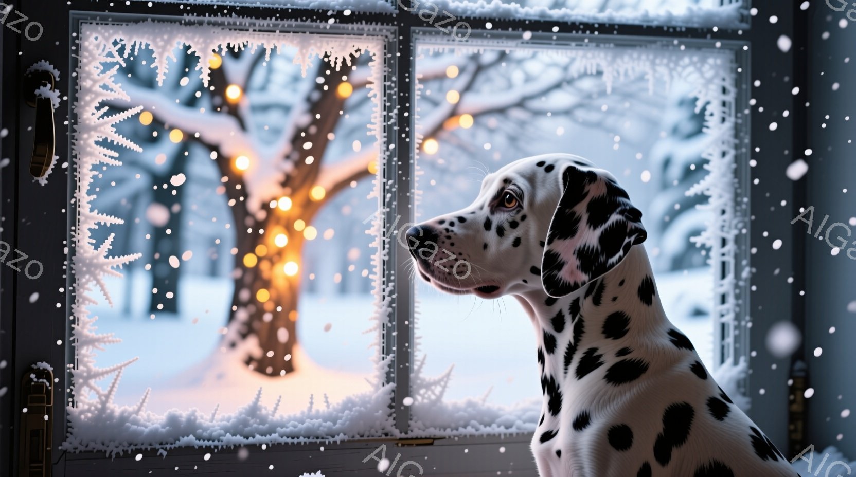 白地に黒い斑点模様のダルメシアンが、雪で覆われた窓枠から外を眺めている。窓の外には、雪景色の中にぼんやりと見える木々と、温かい光を放つ何らかのイルミネーションが広がっており、冬の静寂と安らぎを感じさせる。雪が窓ガラスに付着し、幻想的な雰囲気を醸し出している。