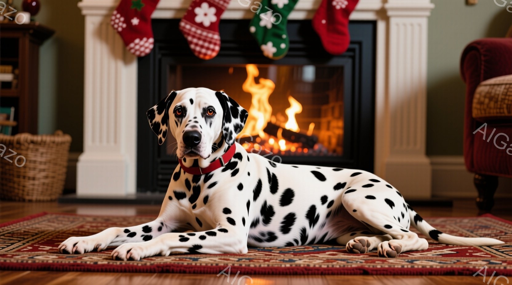 白地に黒い斑点模様のダルメシアンが、暖炉の前にあるカラフルな絨毯の上で横たわっています。暖炉には火が灯っており、温かく心地よい雰囲気を醸し出しています。背景にはクリスマスソックスが飾られており、クリスマスの祝祭の準備が整っている様子が伺えます。