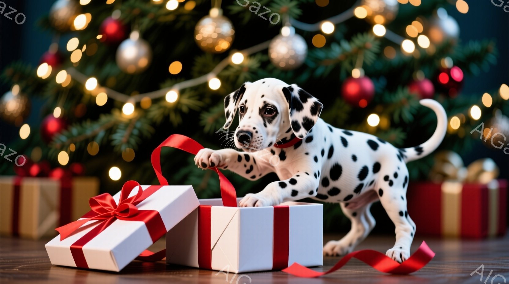 白地に黒い斑点模様の若いダルメシアン犬が、赤いリボンで結ばれた開いたギフトボックスのそばにひざまずいています。犬は興奮した表情で、前足でギフトボックスの中を覗き込もうとしています。背景には、装飾されたクリスマスツリーがぼやけて写っており、暖かくお祝いの雰囲気を醸し出しています。
