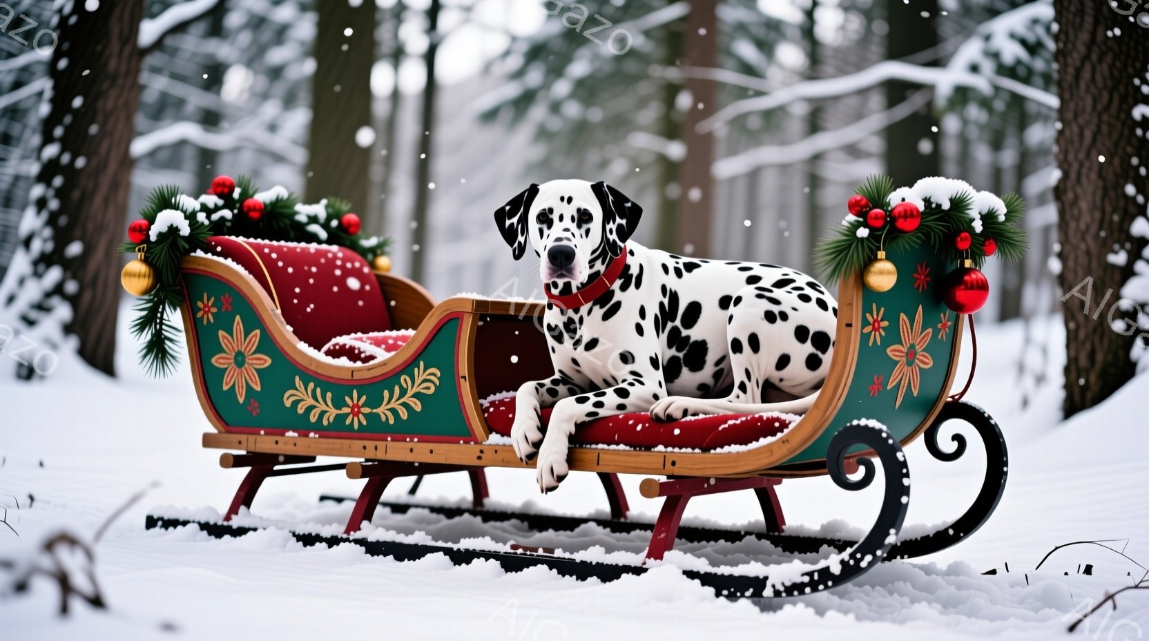 白地に黒斑のダルメシアン犬が、緑と赤で装飾されたそりに横たわっている。そりは雪景色の中にあり、背景には雪に覆われた木々がぼんやりと見え、クリスマスの飾り付けが施されている。全体的に暖かく、穏やかな冬の雰囲気が漂っている。
