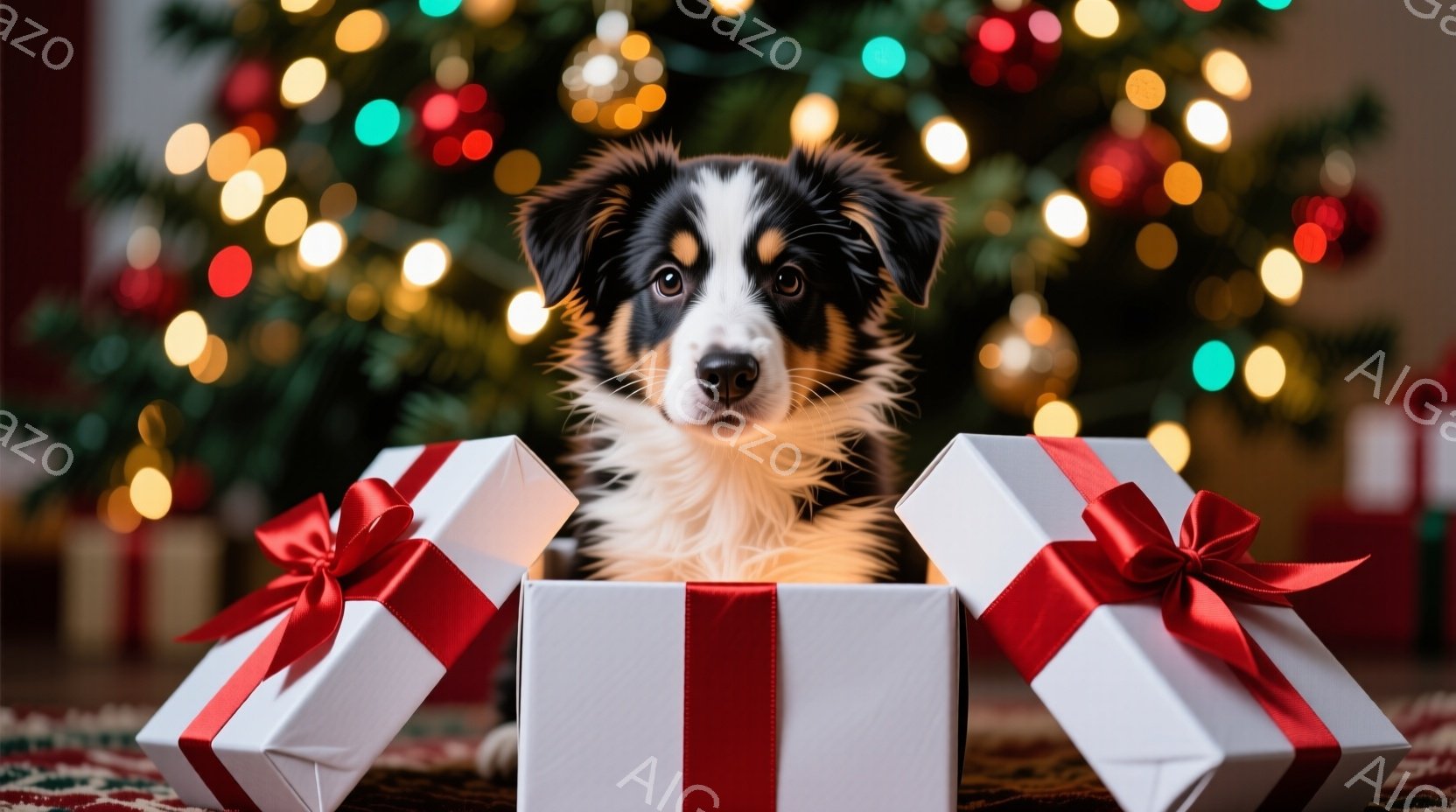 白いギフトボックスから顔を出している子犬が写っています。毛並みは茶色と白と黒で、愛らしい表情でカメラを見ています。背景にはクリスマスツリーのぼんやりとした光と装飾が映り、温かく幸せな雰囲気を醸し出しています。