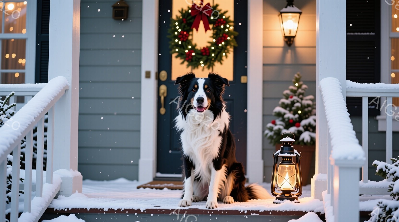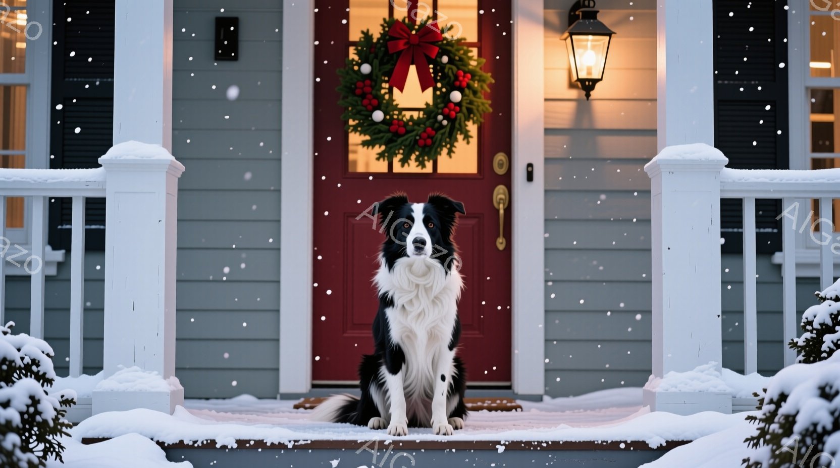 白と黒のボーダーコリーが雪の積もった家の外の階段に座っています。家のドアは濃い青色で、クリスマスリースが飾られ、温かい光が灯っています。雪が舞い降り、冬の穏やかで静かな雰囲気を醸し出しています。