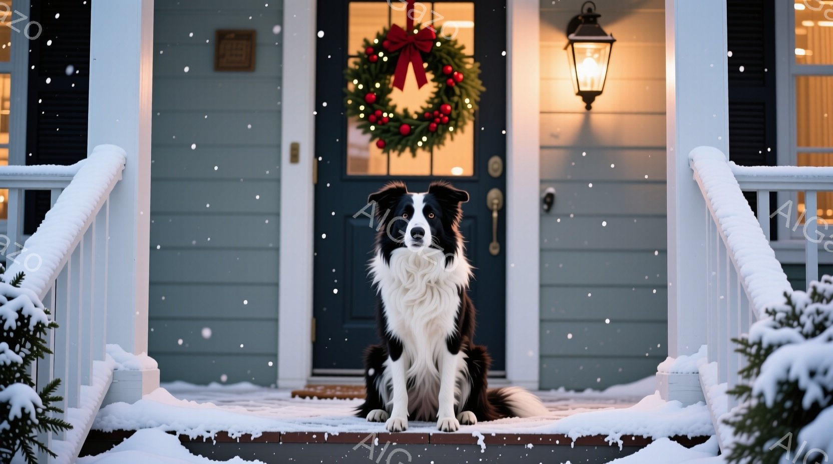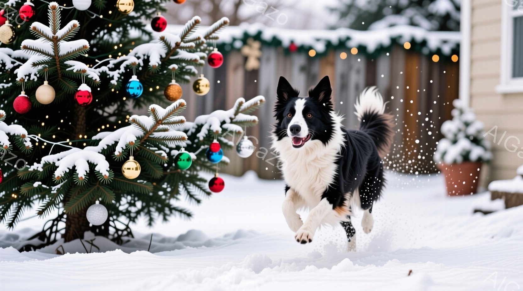 白い雪景色の中に、黒と白のボーダーコリーが勢いよく駆け抜けている。クリスマスツリーが近くにあり、赤いオーナメントやゴールドの飾りで彩られ、雪が積もった庭が背景に見える。犬は口を開けて楽しそうに走り、冬の暖かく幸せな雰囲気が漂っている。